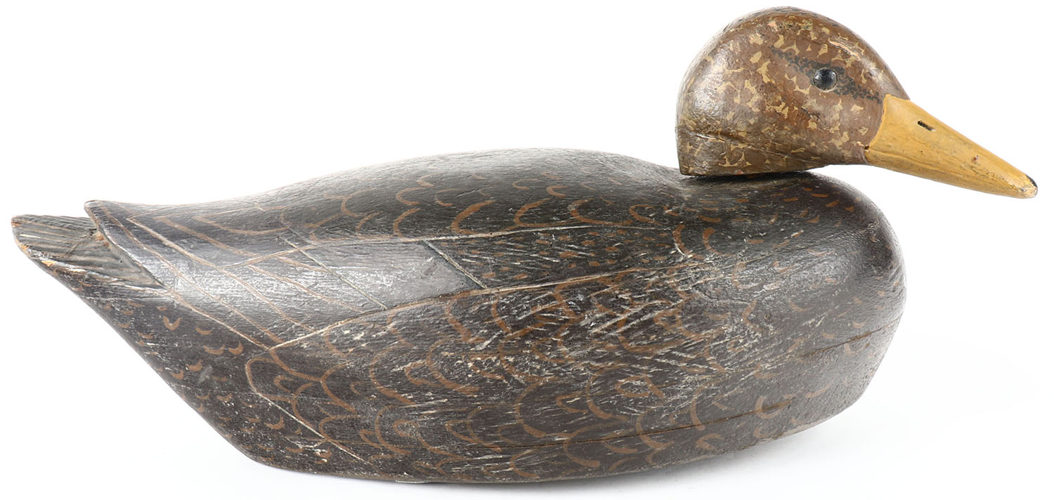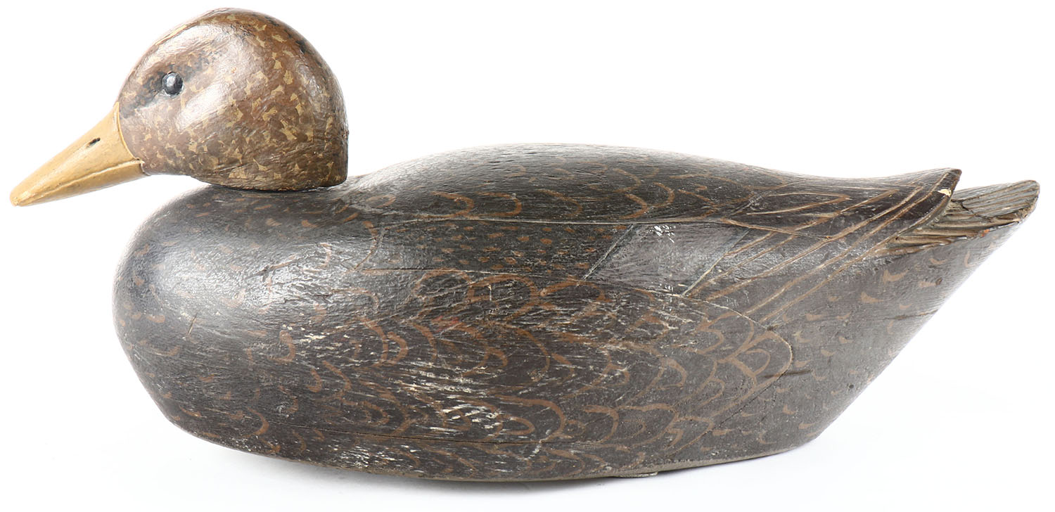 Black Duck by unknown factory maker, CE, solid wood, original paint, structurally excellent, 16 1/2'' OAL. Grade: Excellent - Value: 40 to 80