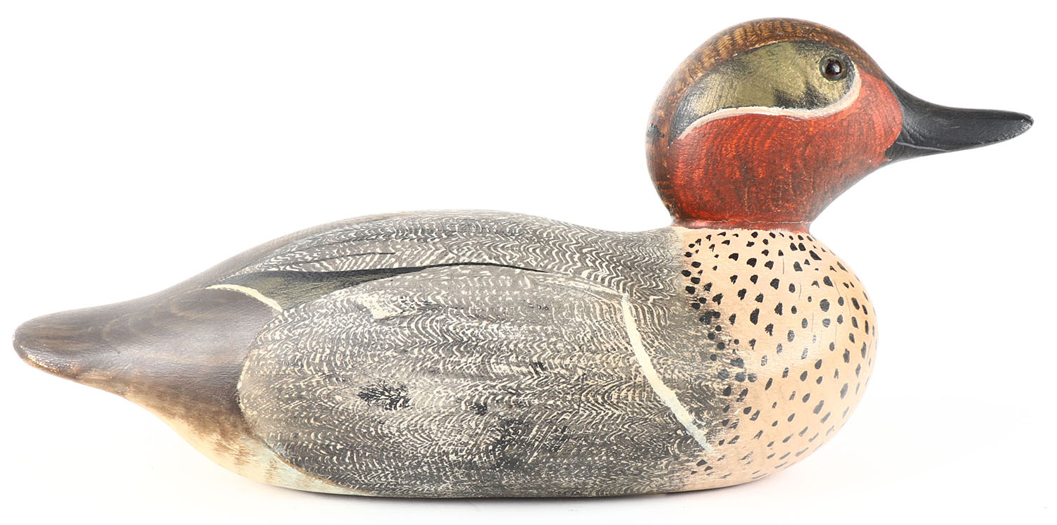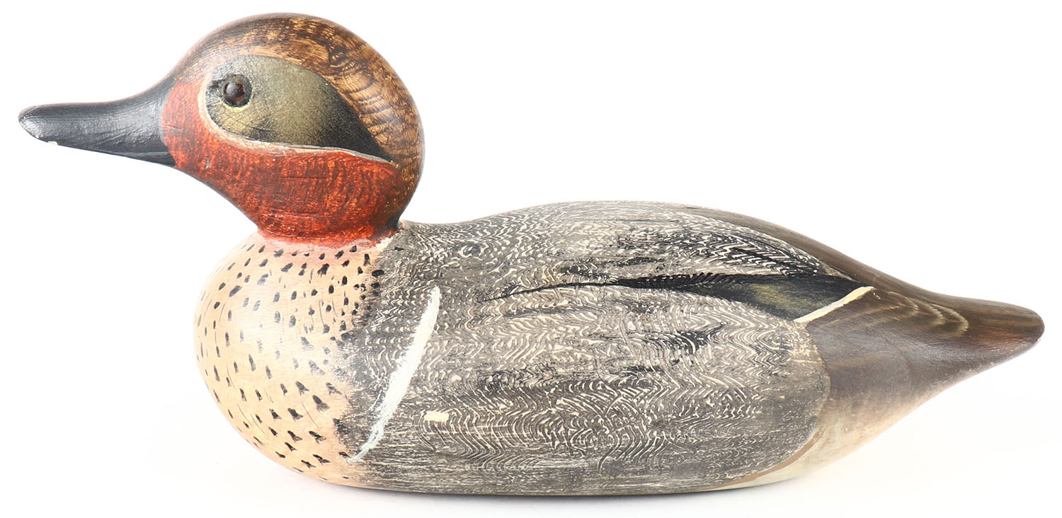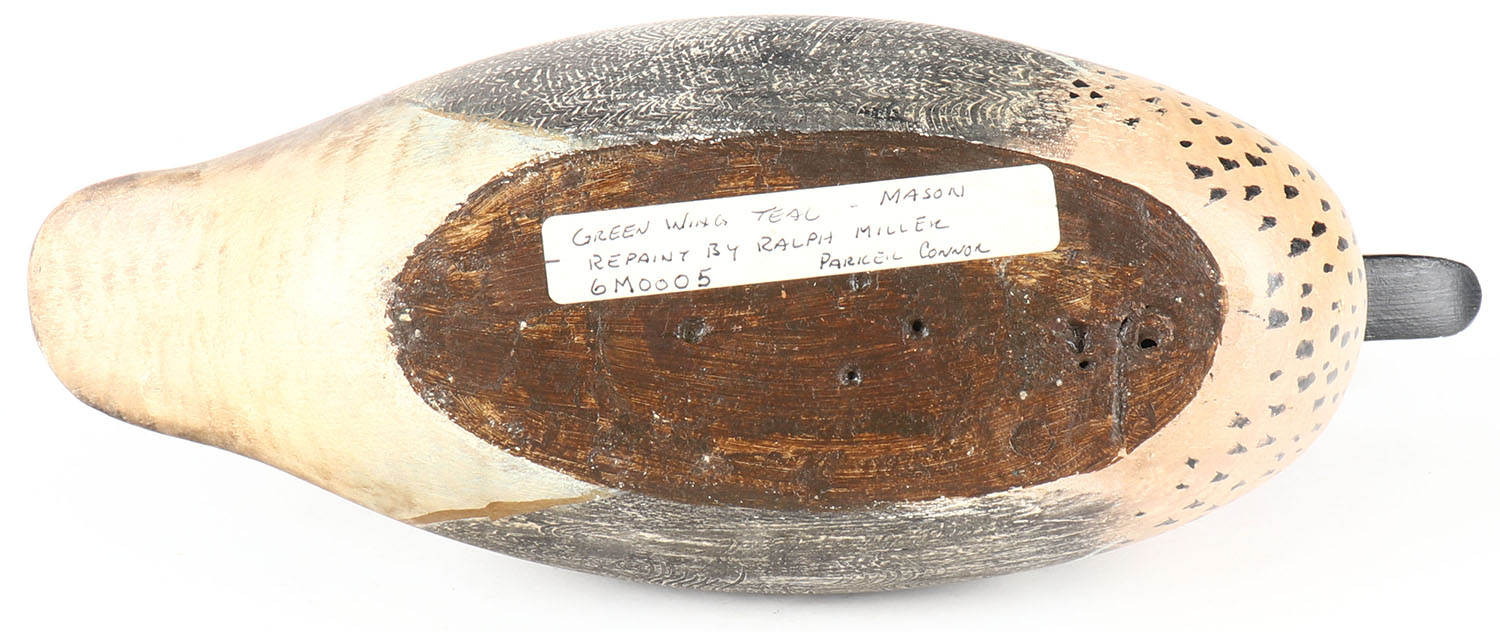 Greenwing Teal Drake by Mason Decoy Company, Detroit, MI, 1896-1924, Standard Grade, glass eyes, solid wood, wonderful repaint by Ralph Miller, structurally excellent, 12'' OAL. Grade: Excellent - Value: 30 to 60