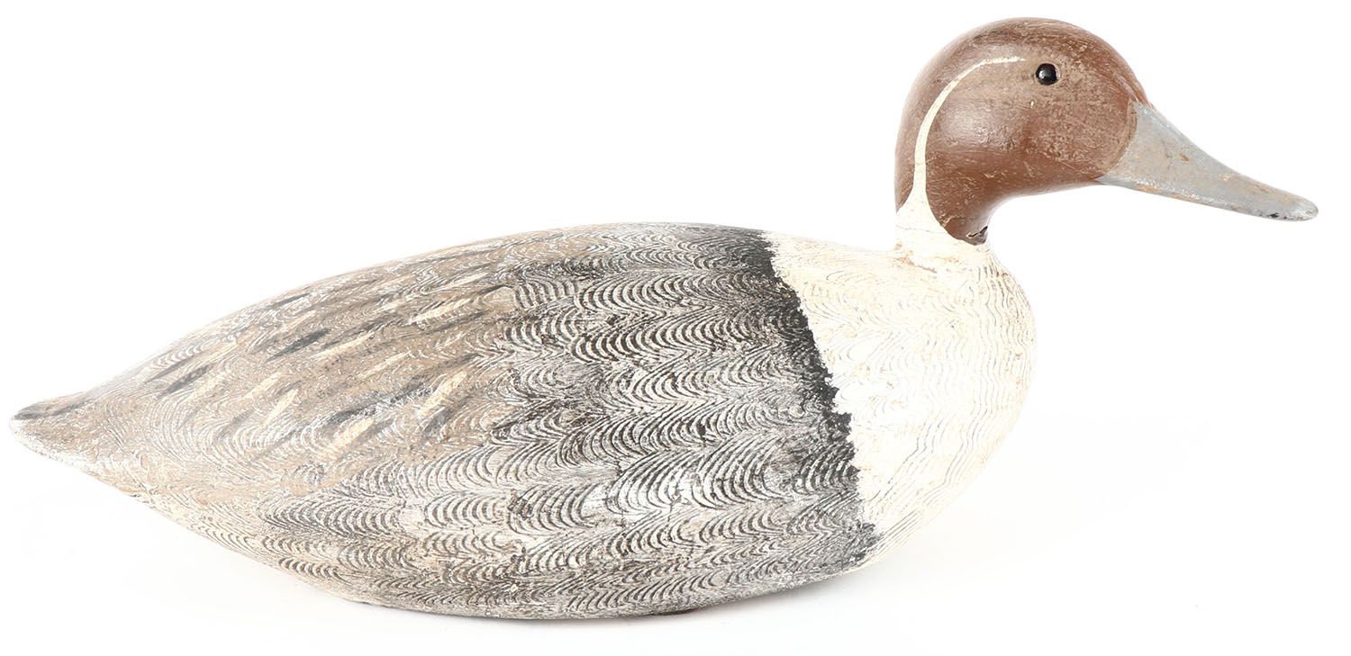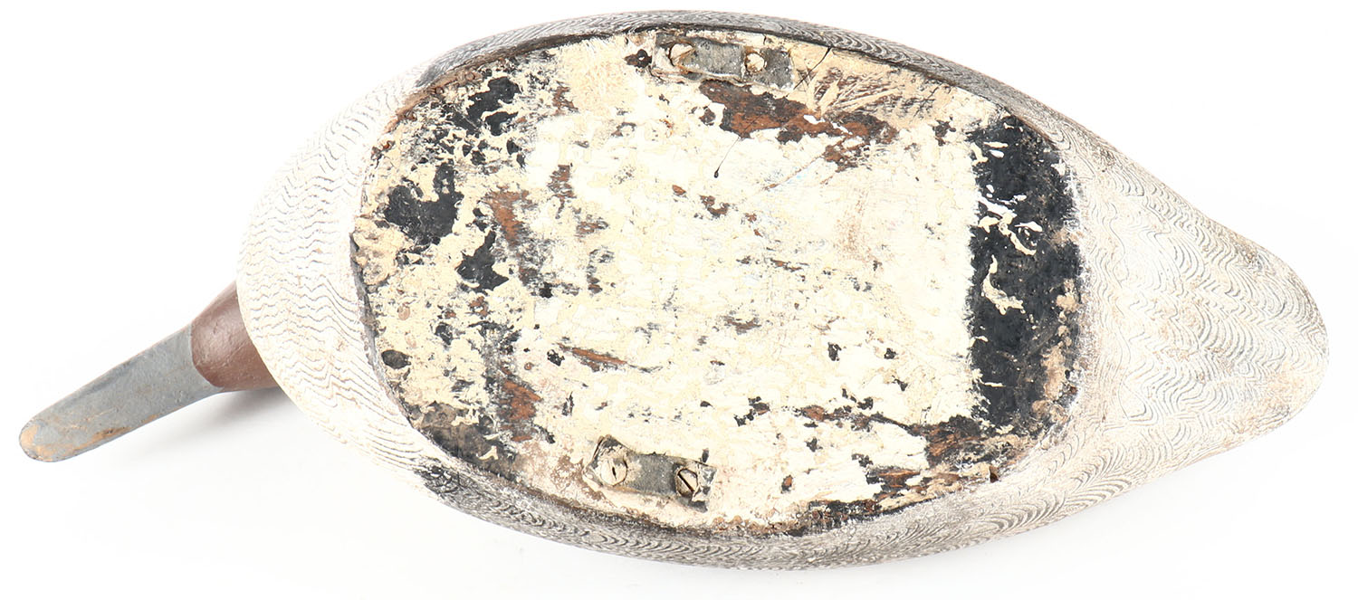 Pintial Drake by unknown maker, GE, hollow wood, original comb paint, structurally excellent, has two leather line ties on long side of bottom, 15'' OAL. Grade: Very Good ++ - Value: 50 to 100