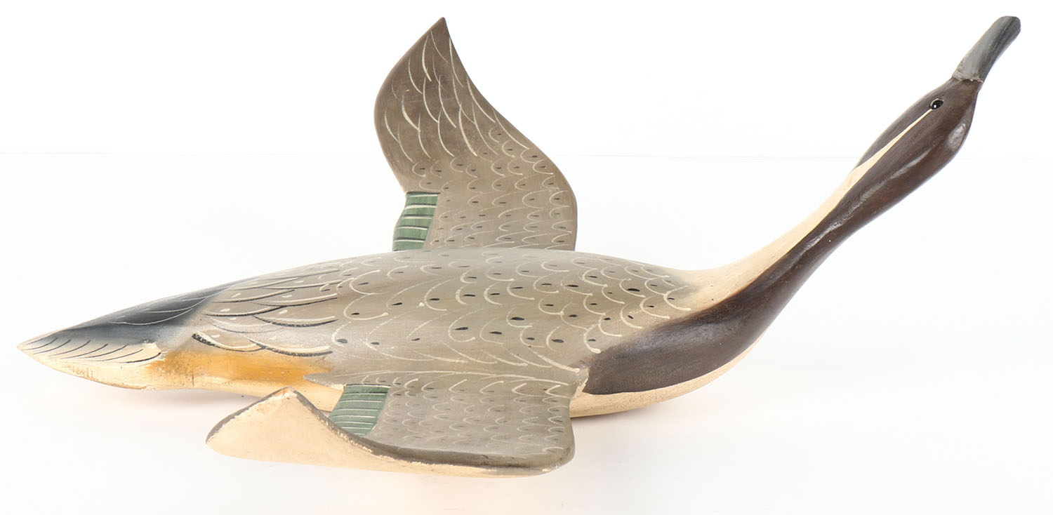 Flying Pintail Drake by Jimmy Bowden, Chincoteague, VA, GE, solid wood, original paint, structurally excellent, 17 1/2'' OAL. Grade: Excellent - Value: 50 to 100