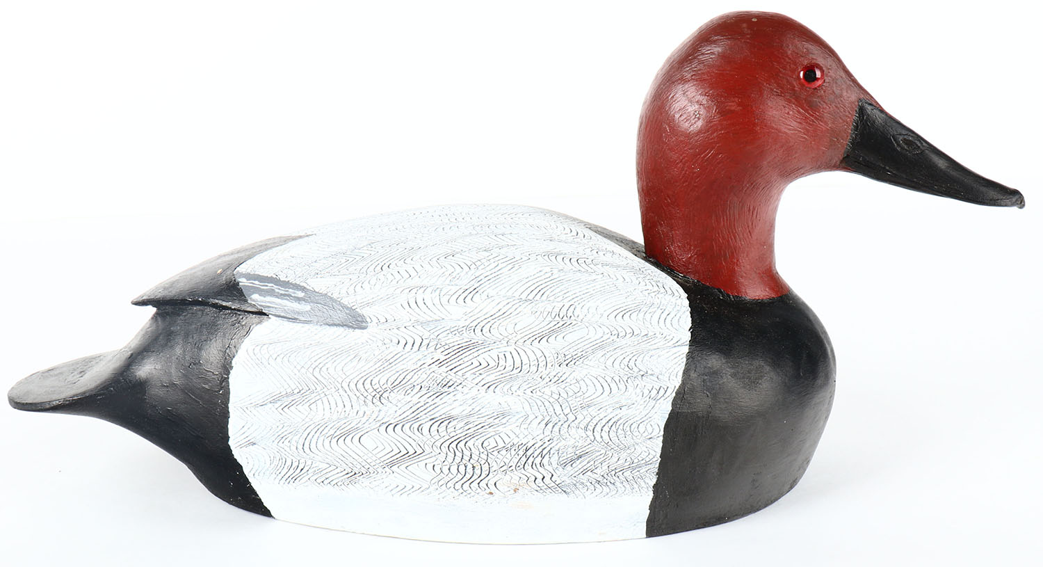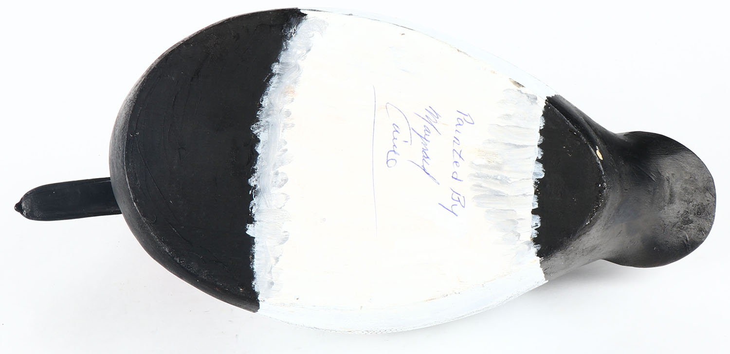 Canvasback Drake by Maynard Caine, Ontario, Canada, glass eyes, hollow wood with bottom board, original comb paint, structurally excellent, signed on bottom. Grade: Excellent + - Value: 30 to 60