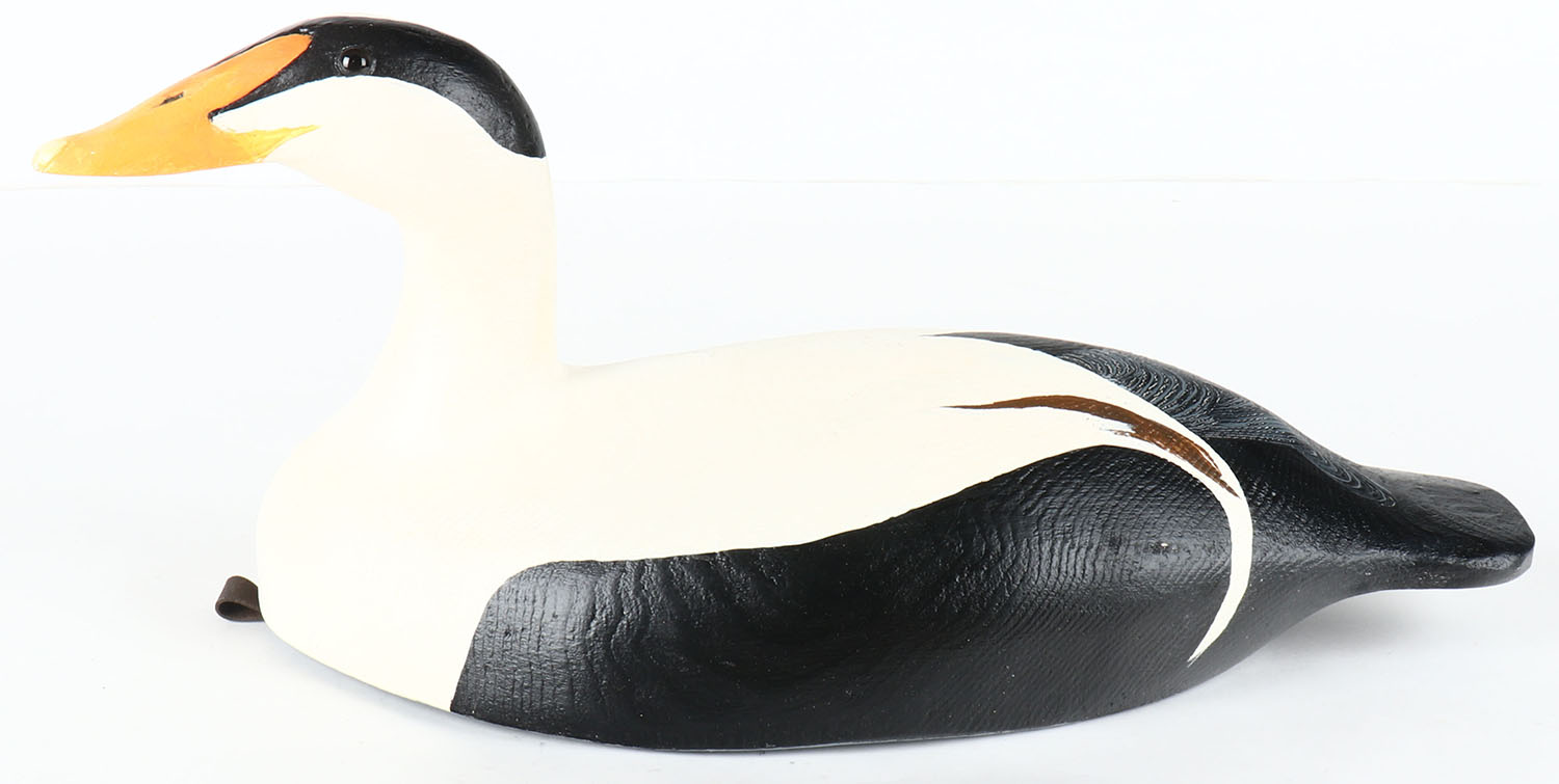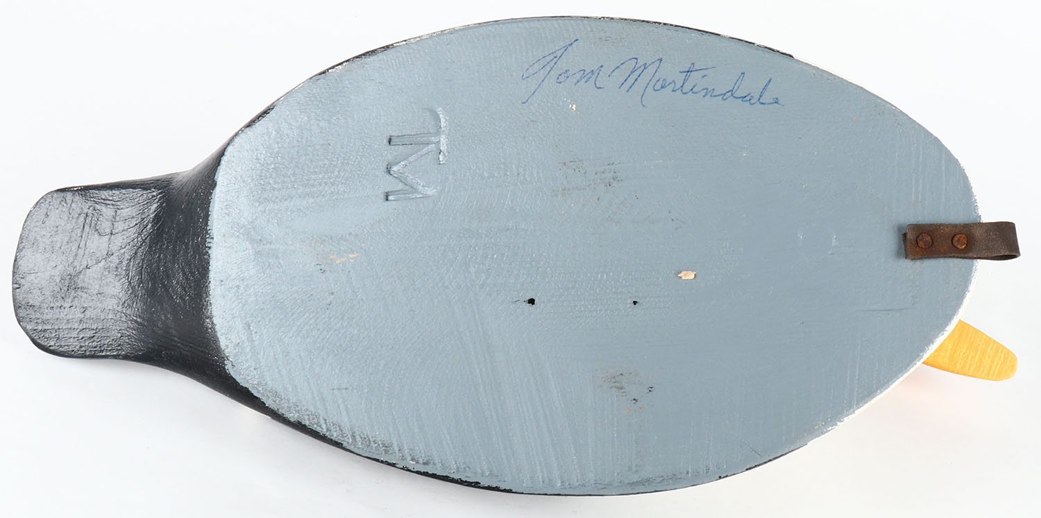 Eider by Tom Martindale, Ontario, Canada, glass eyes, solid wood, original paint, structurally excellent, branded TM & signed on bottom, 17 1/2'' OAL. Grade: MINT - Value: 50 to 100