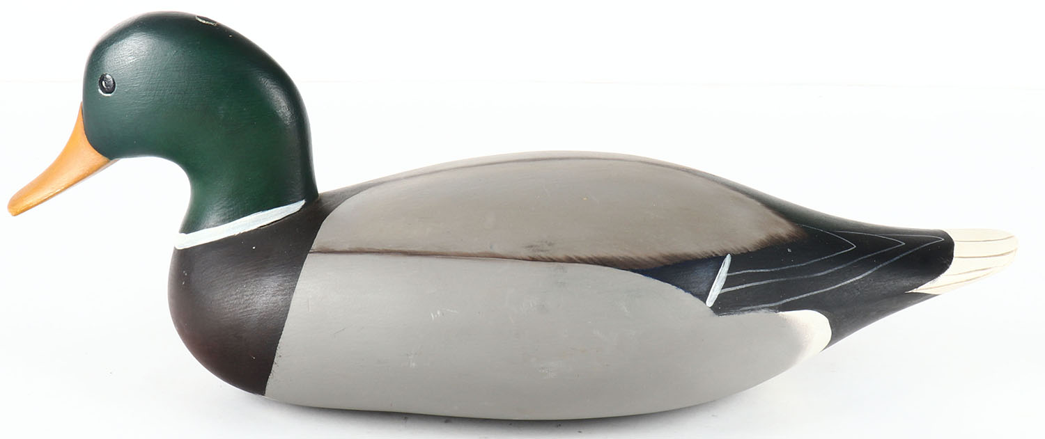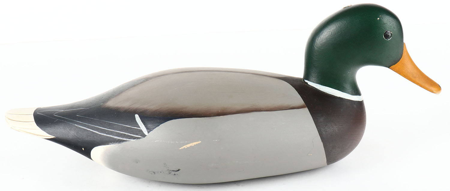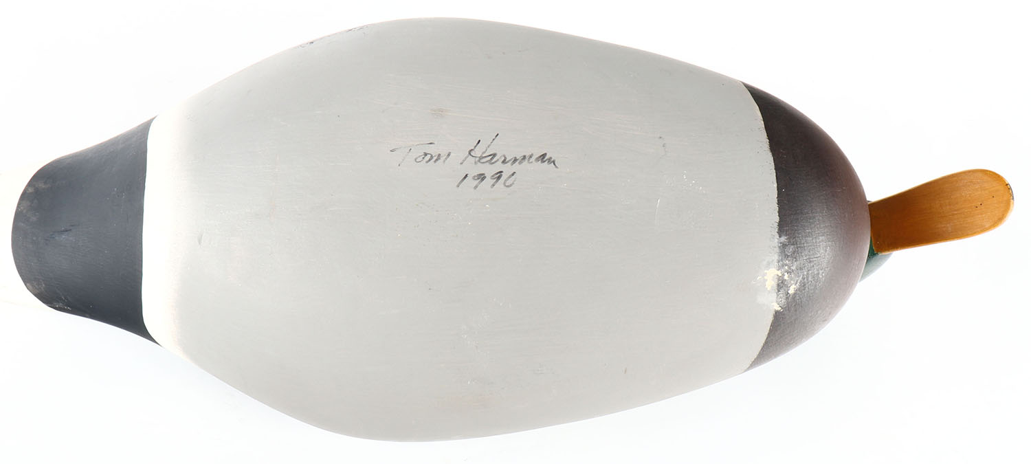 Mallard Drake by Tom Harman, PE, solid wood, original paint, signed on bottom, 16'' OAL. Grade: Excellent + - Value: 40 to 80