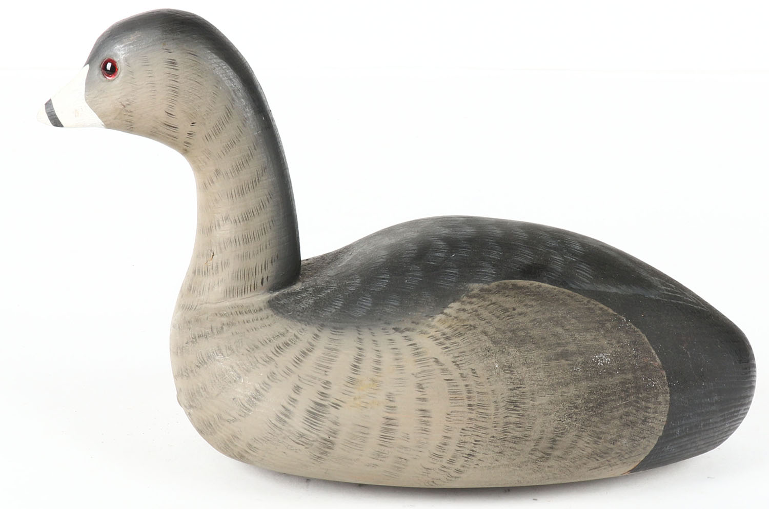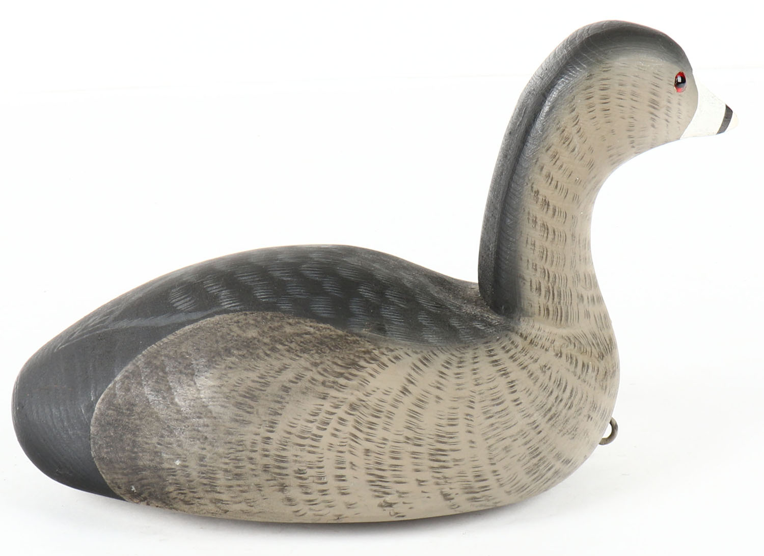 Coot by C.W. Waterfield, VA. Beach, VA, GE, solid wood, wonderful original paint iwth feather details, signed on bottom, 9''. Grade: MINT - Value: 30 to 60