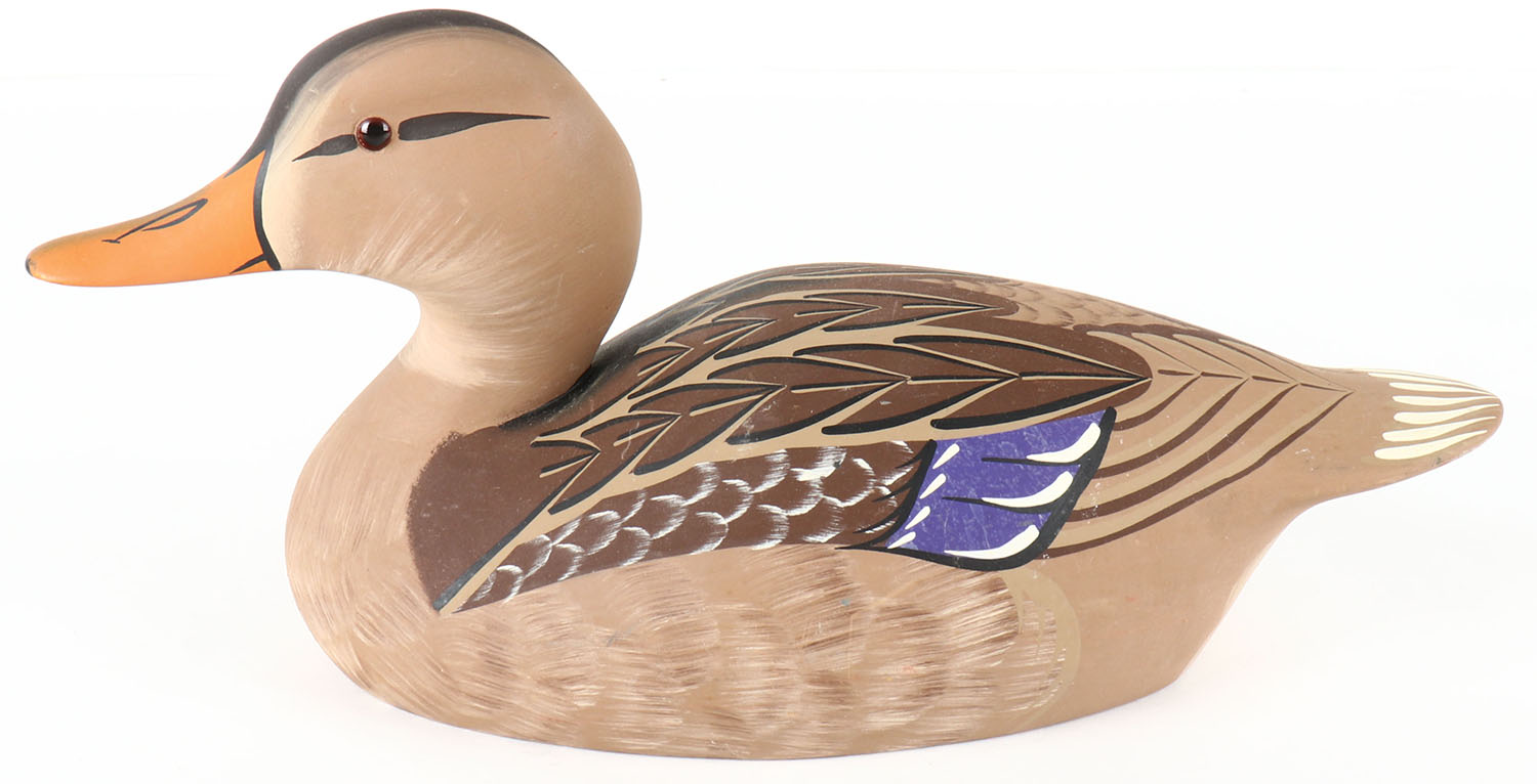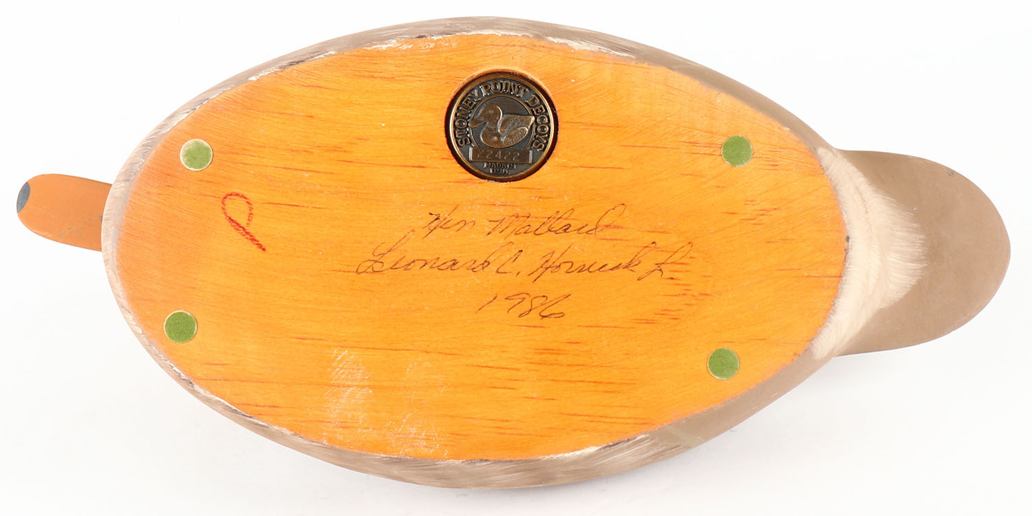 Mallard Hen by Lenard C. Hornick, Stoney Point Decoys, Oak Hal, VA, glass eyes, solid wood, original paint, structurally excellent, stamped & signed on bottom. Grade: Excellent + - Value: 20 to 50