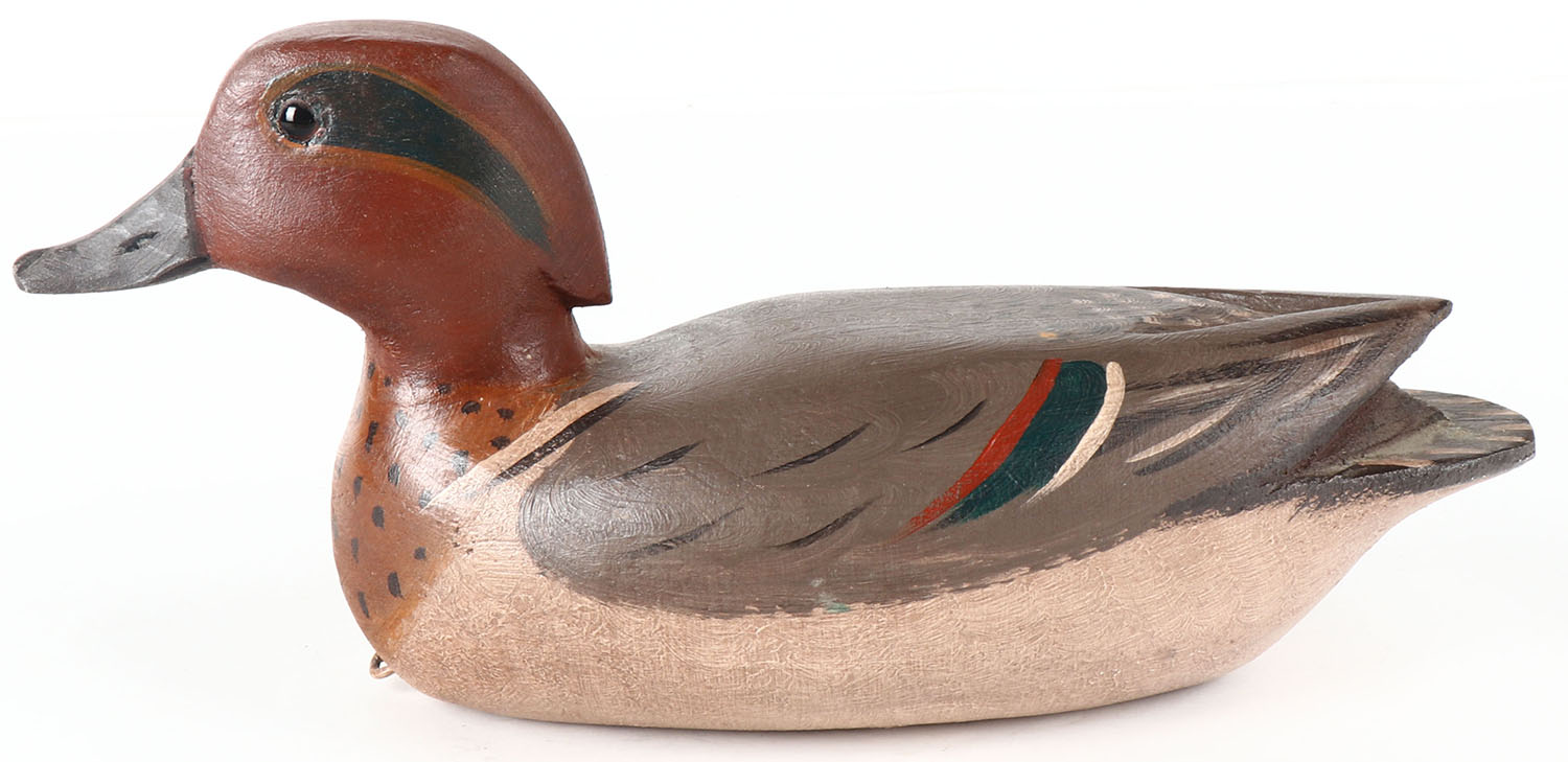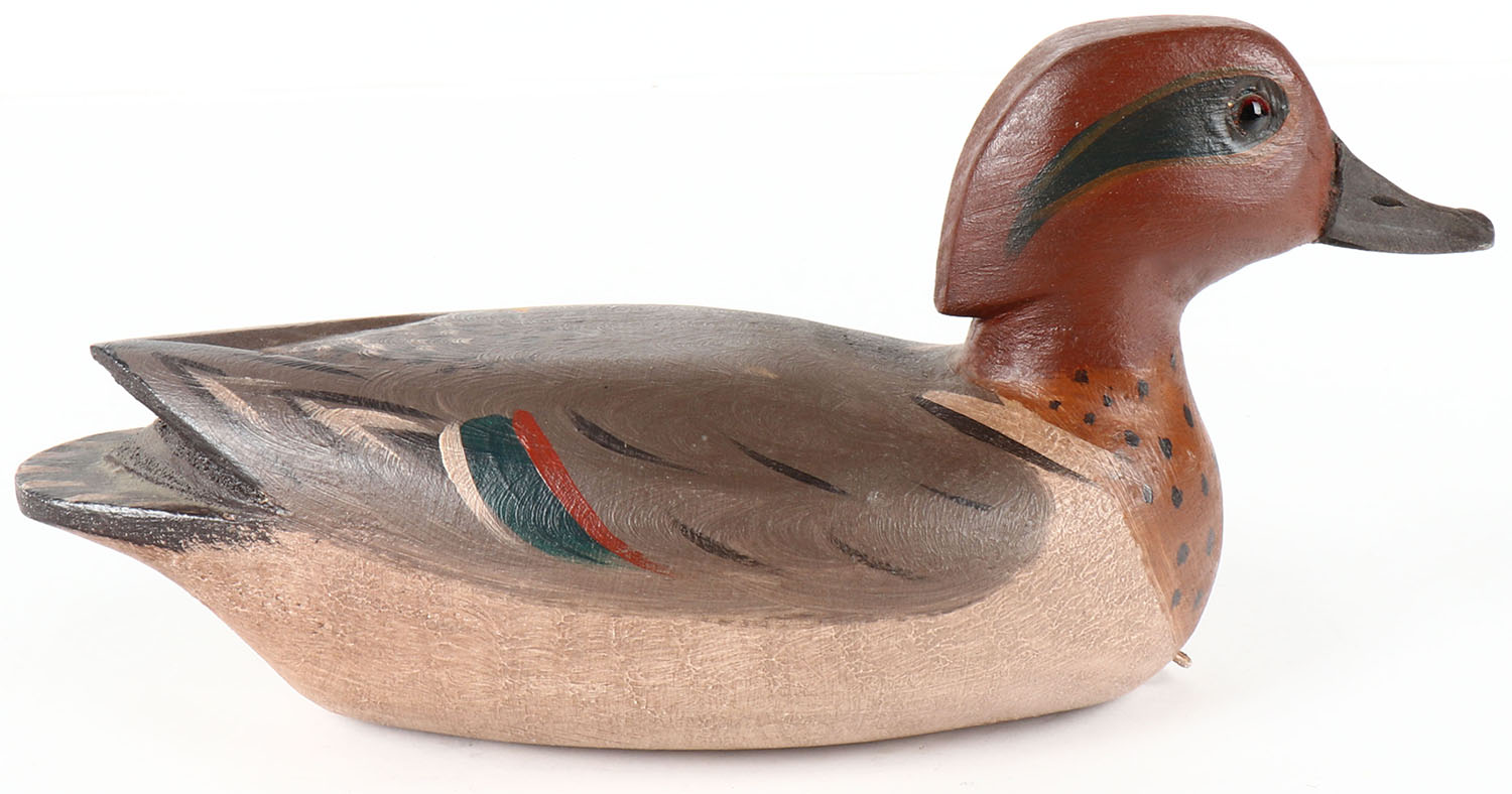 Greenwing Teal Drake by Jim Slack, Pekin, IL, glass eyes, hollow wood, excellent original paint, 11 1/2'' OAL. Grade: Excellent ++ - Value: 50 to 200