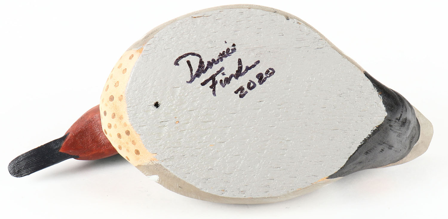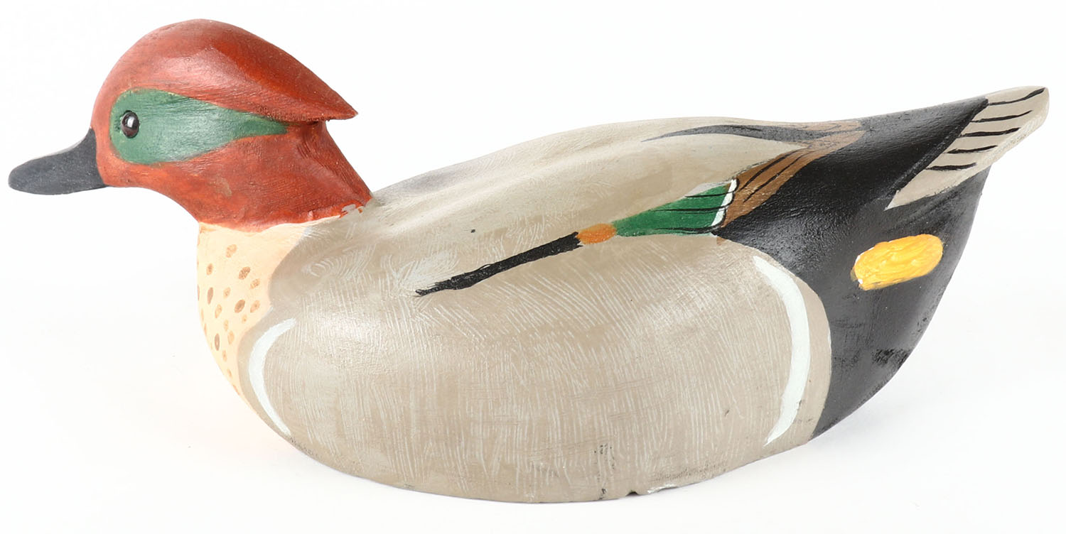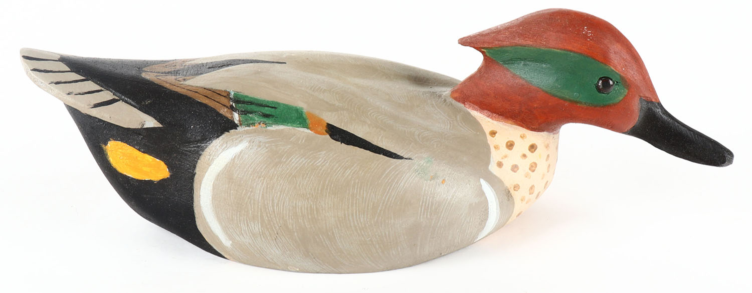 Greenwing Teal Drake by Dennis Finden, glass eyes, solid wood, original paint, structurally excellent, 12'' OAL. Grade: Excellent ++ - Value: 20 to 75