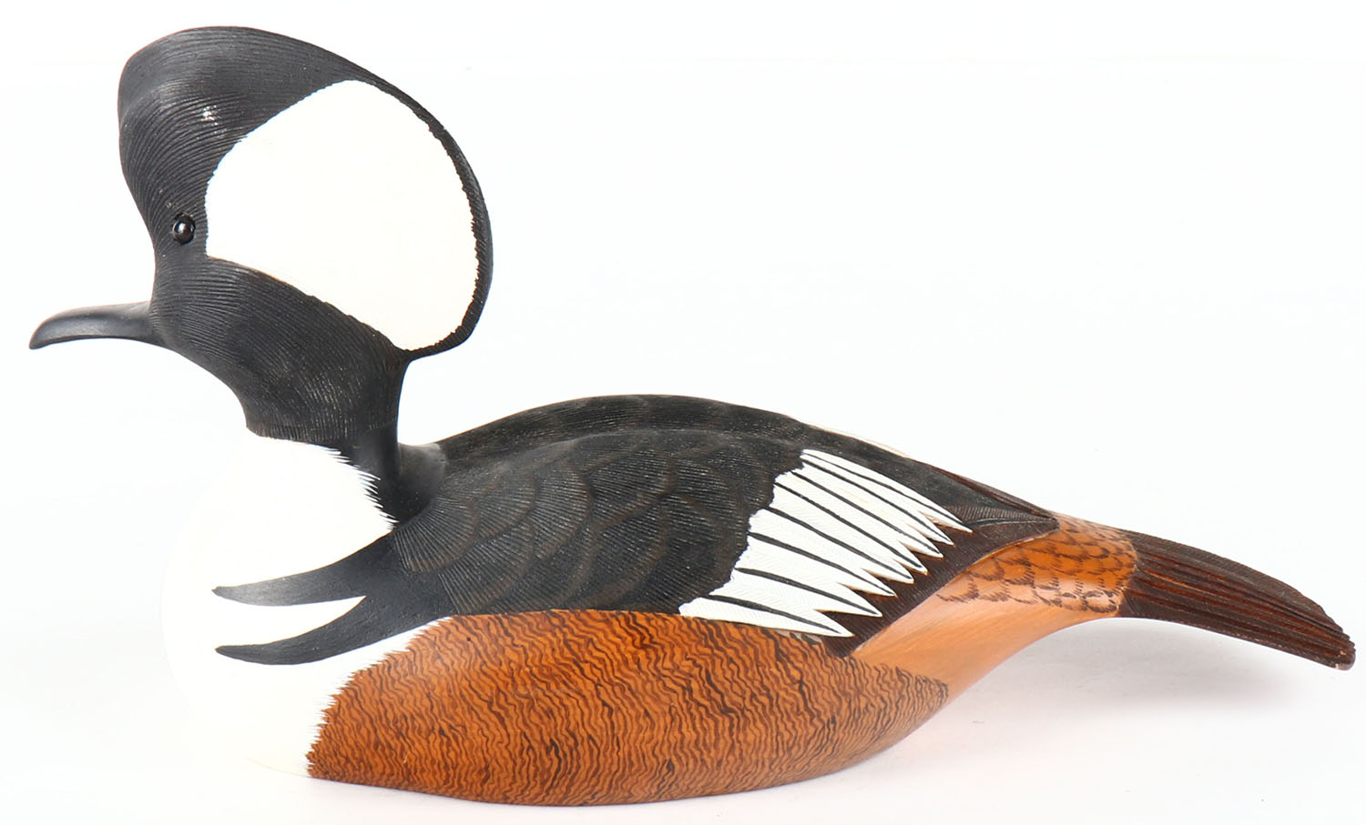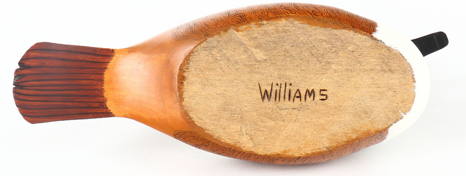 Hooded Merganser Drake by Williams, GE, solid wood, mint original paint, structurally excellent, 10'' OAL. Grade: Excellent ++ - Value: 40 to 80