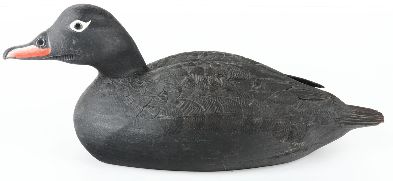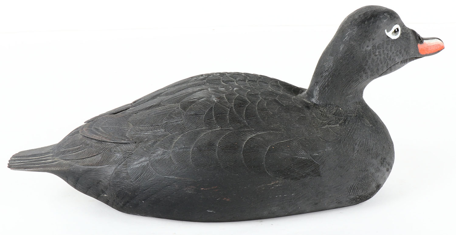 White Winged Scoter Drake by Gould, ME, glass eyes, solid wood, original paint, structurally excellent, signed on bottom, 14'' OAL. Grade: Excellent + - Value: 40 to 80