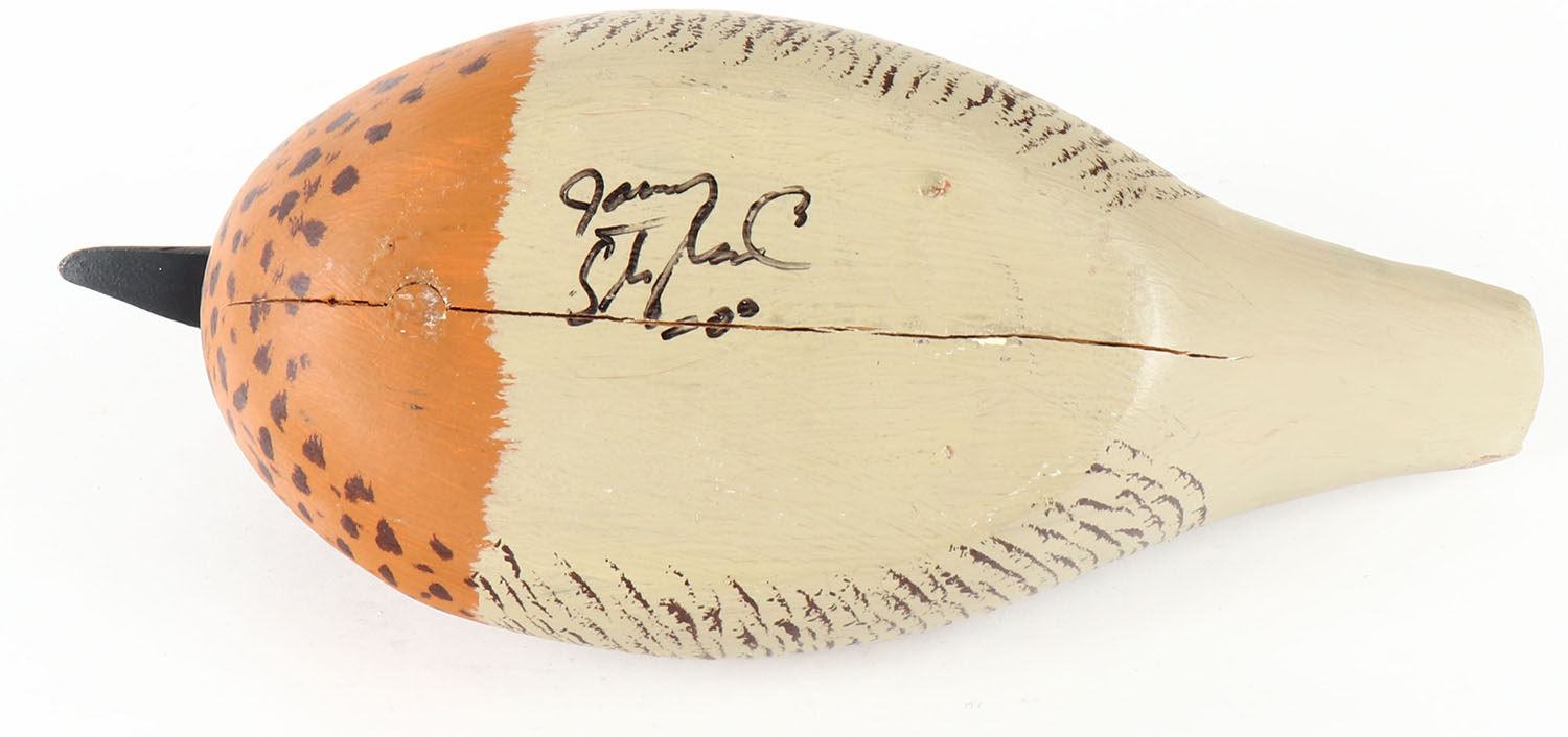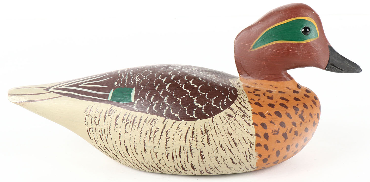 Greenwing Teal Drake by Jerry?????, glass eyes, solid wood, original paint, structurally excellent, signed on bottom, 10'' OAL. Grade: Excellent + - Value: 20 to 60