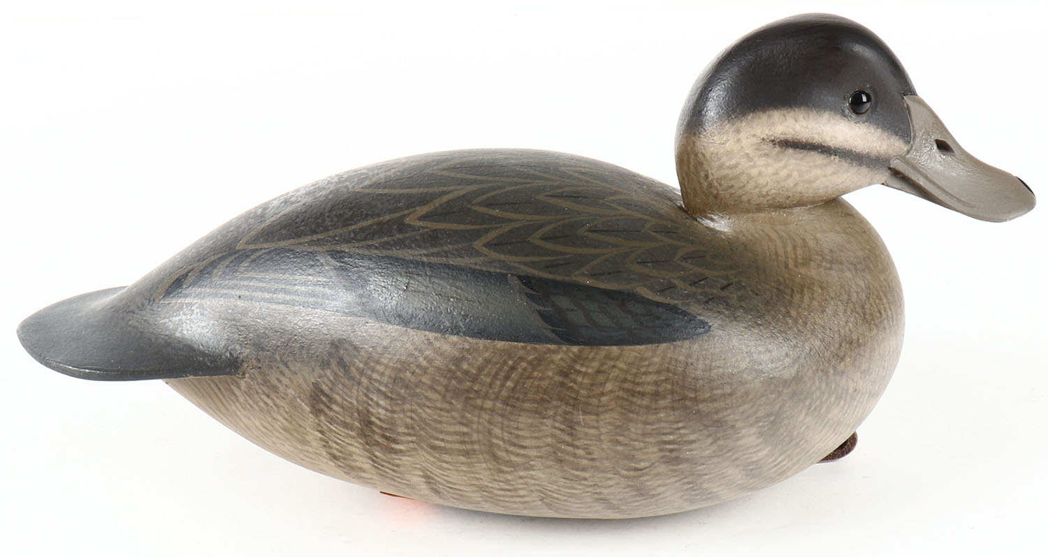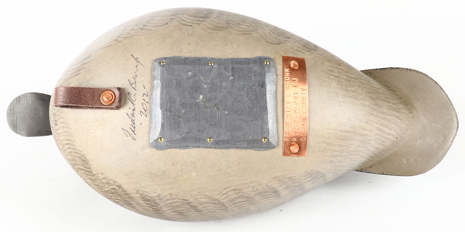 Ruddyduck Hen by Frederick C. Brown, RT Pleasant N.J. Ocean County, glass eyes, hollow wood, excellent original paint, structurally excellent, copper tag by FREDERICK C. BROWN on bottom, Paired Drake is in the prevoius lot. Grade: MINT - Value: 100 to 200