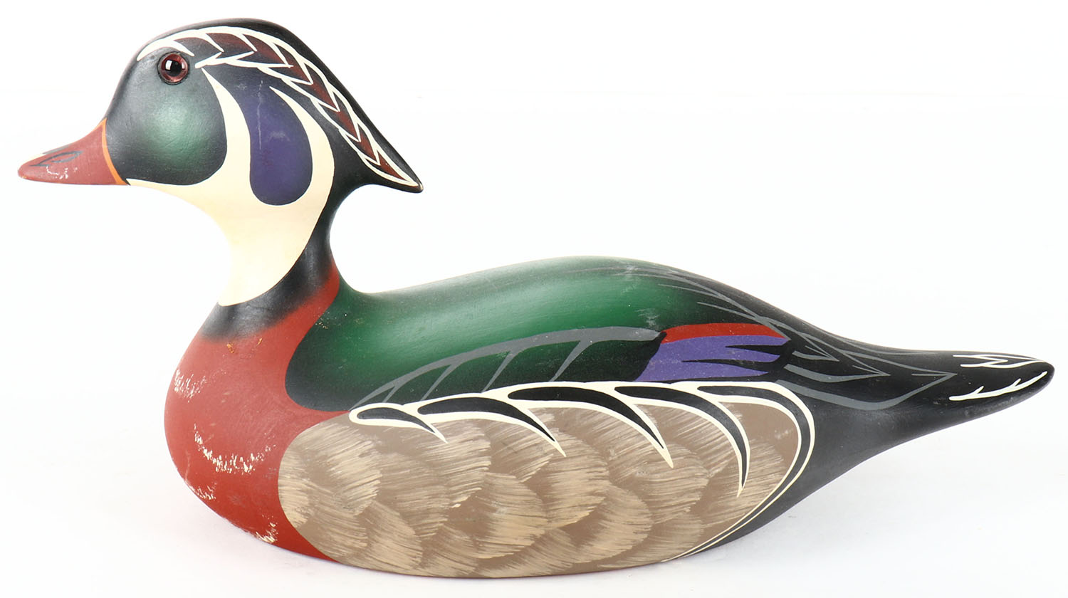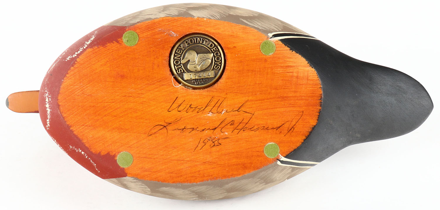 Woodduck Drake by Lenard C. Hornick, Stoney Point Decoys, glass eyes, solid wood, original paint, structurally excellent, stamped & signed on bottom, hen pair is lot 6194. Grade: Excellent + - Value: 20 to 40