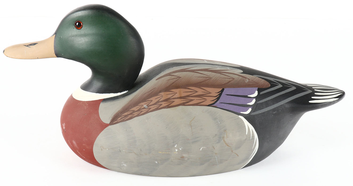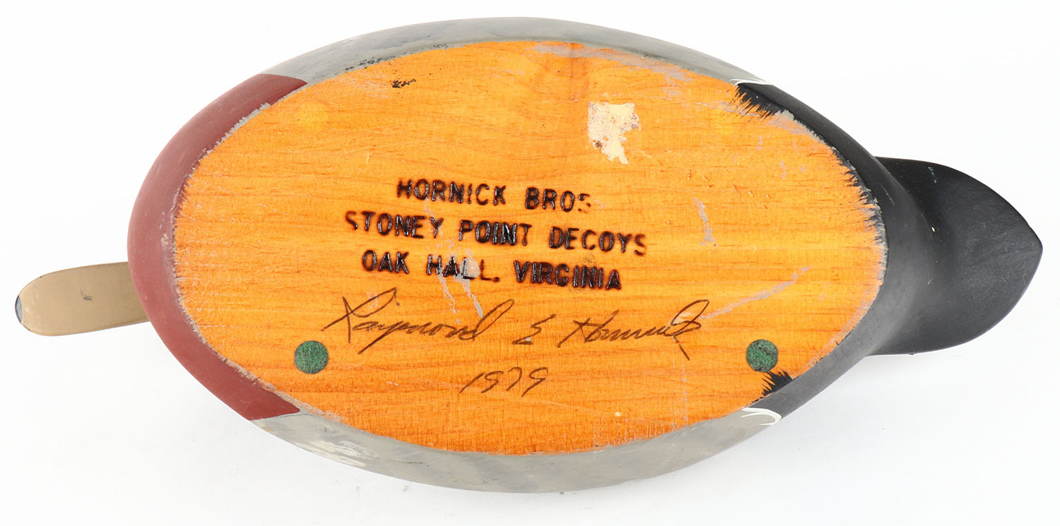 Woodduck Drake by Raymond Hornick, Stoney Point Decoys, Oak Hall, VI, glass eyes, solid wood, original paint, structurally excellent, stamped & signed on bottom. Grade: Excellent + - Value: 20 to 40