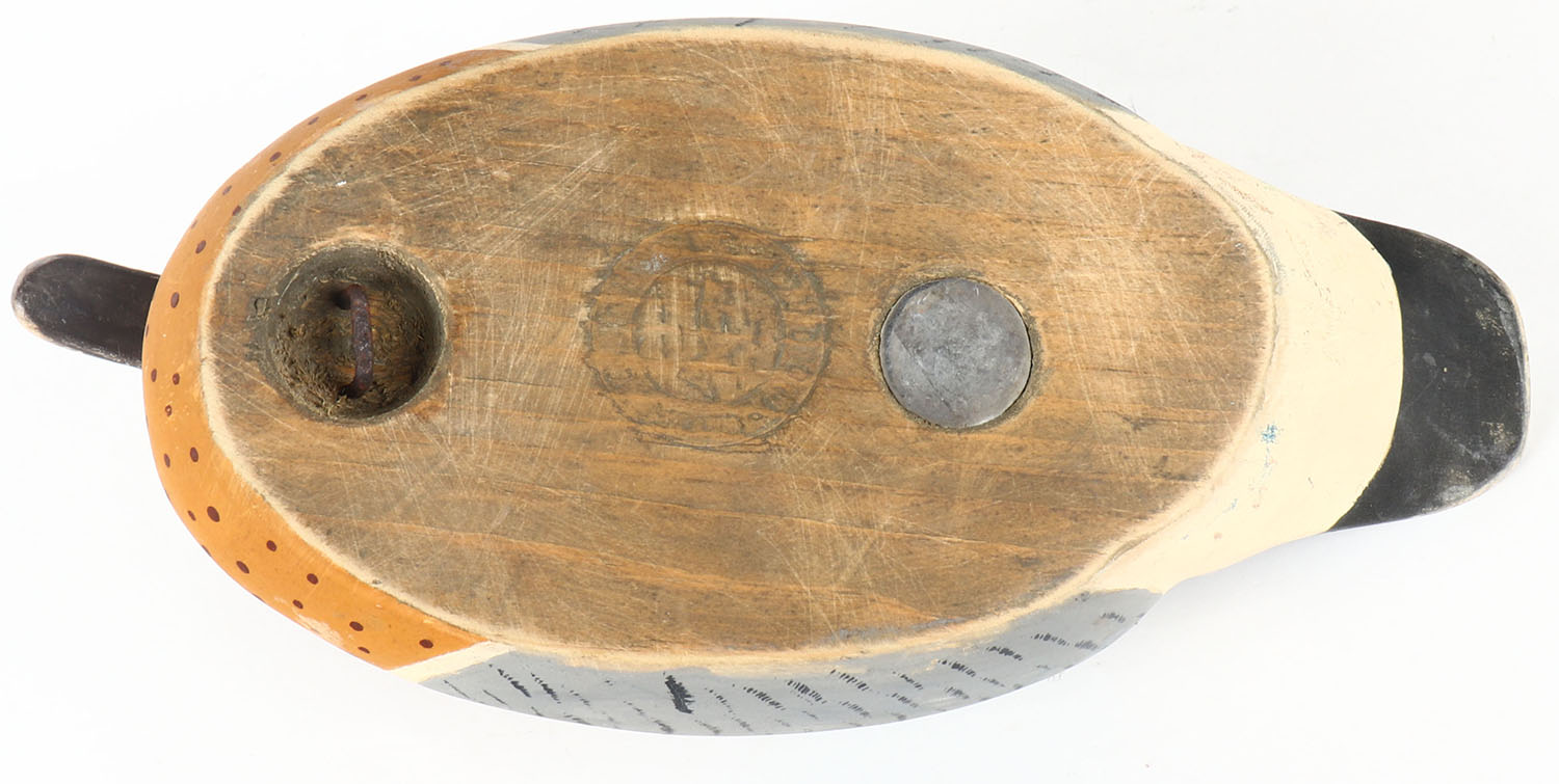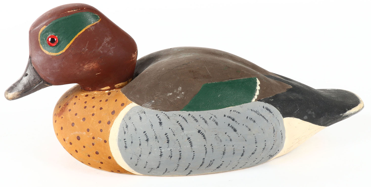 Greenwing Teal Drake by Wildfowl Decoys Inc., Quogue, NY, glass eyes, solid wood, original paint, structurally excellent, stamped on bottom, 10'' OAL. Grade: Excellent - Value: 20 to 40