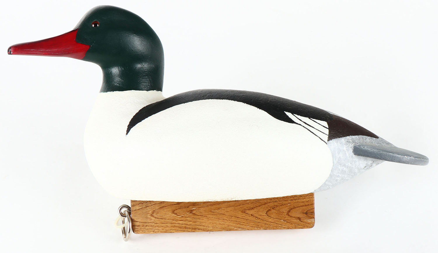 Common Merganser by Walt Papke, GE, cork body, mint original paint, 19'' OAL. Grade: MINT - Value: 60 to 150