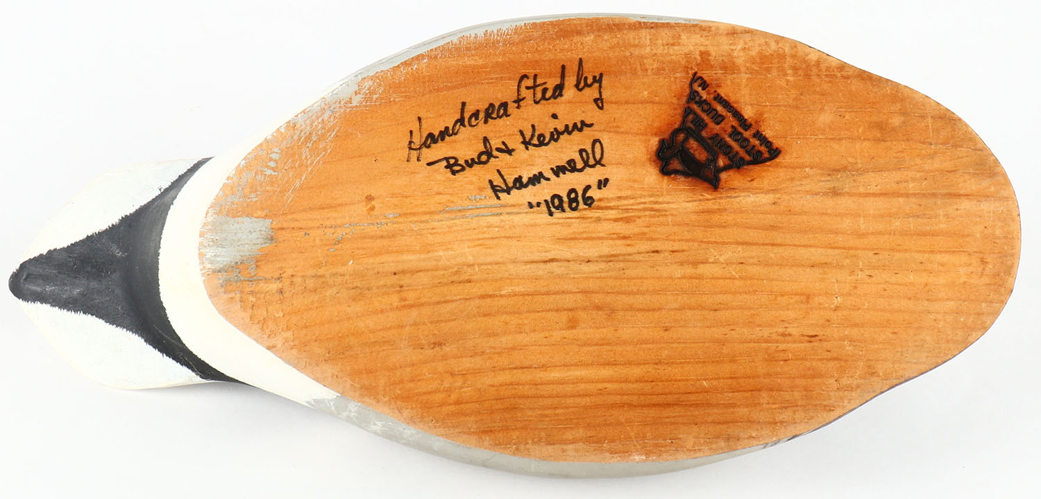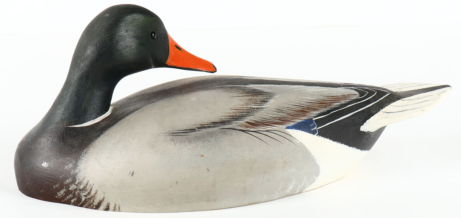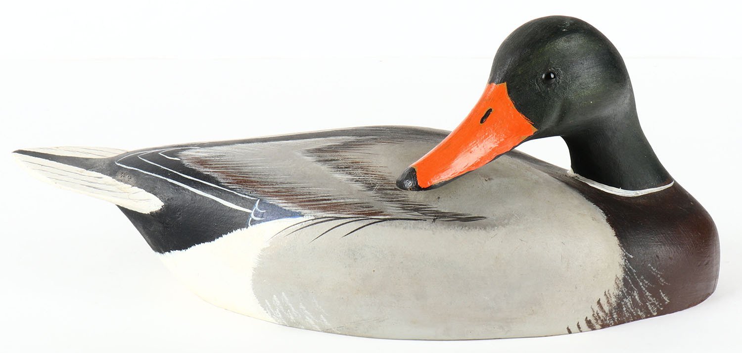 Preening Mallard Drake by Bud & Kevin Hammell, Pt. Pleasent NJ, GE, solid wood, nice original paint, 13'' OAL. Grade: Excellent ++ - Value: 30 to 60