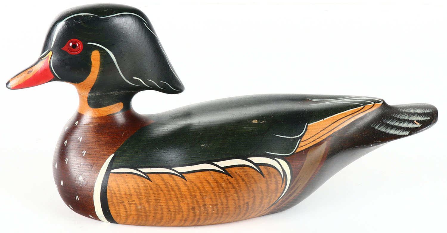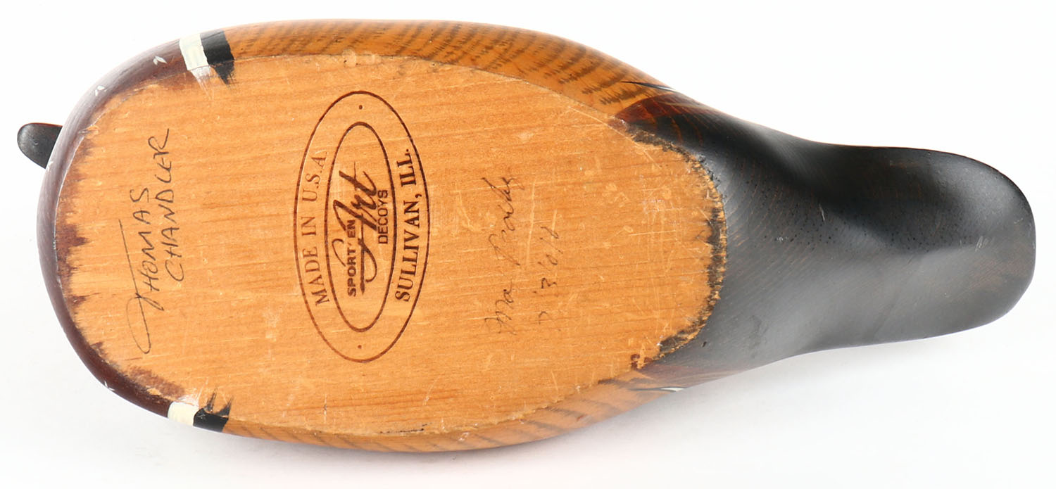 Woodduck Drake by Thomas Chandler, Sullvan, ILL, GE, hollow wood, original paint, has repaired neck crack, 13'' OAL. Grade: Very Good ++ - Value: 10 to 40