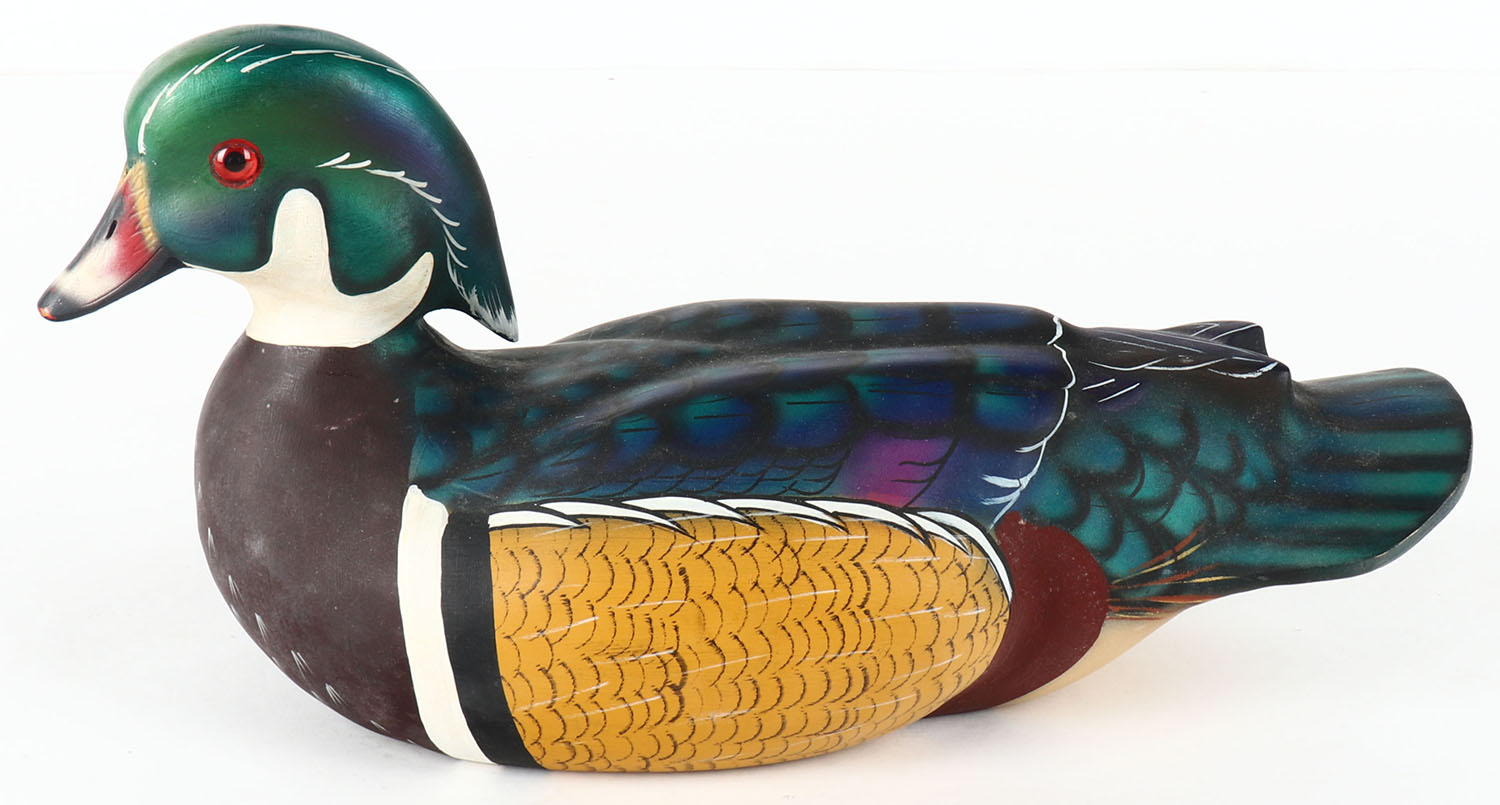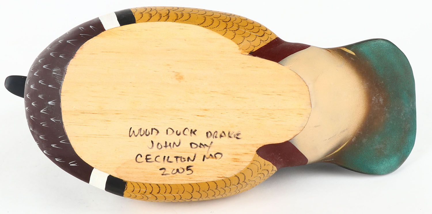 Woodduck Drake by John Day Cecilton MD, GE, solid wood, original paint, 13 1/2'' OAL. Grade: Excellent ++ - Value: 20 to 60
