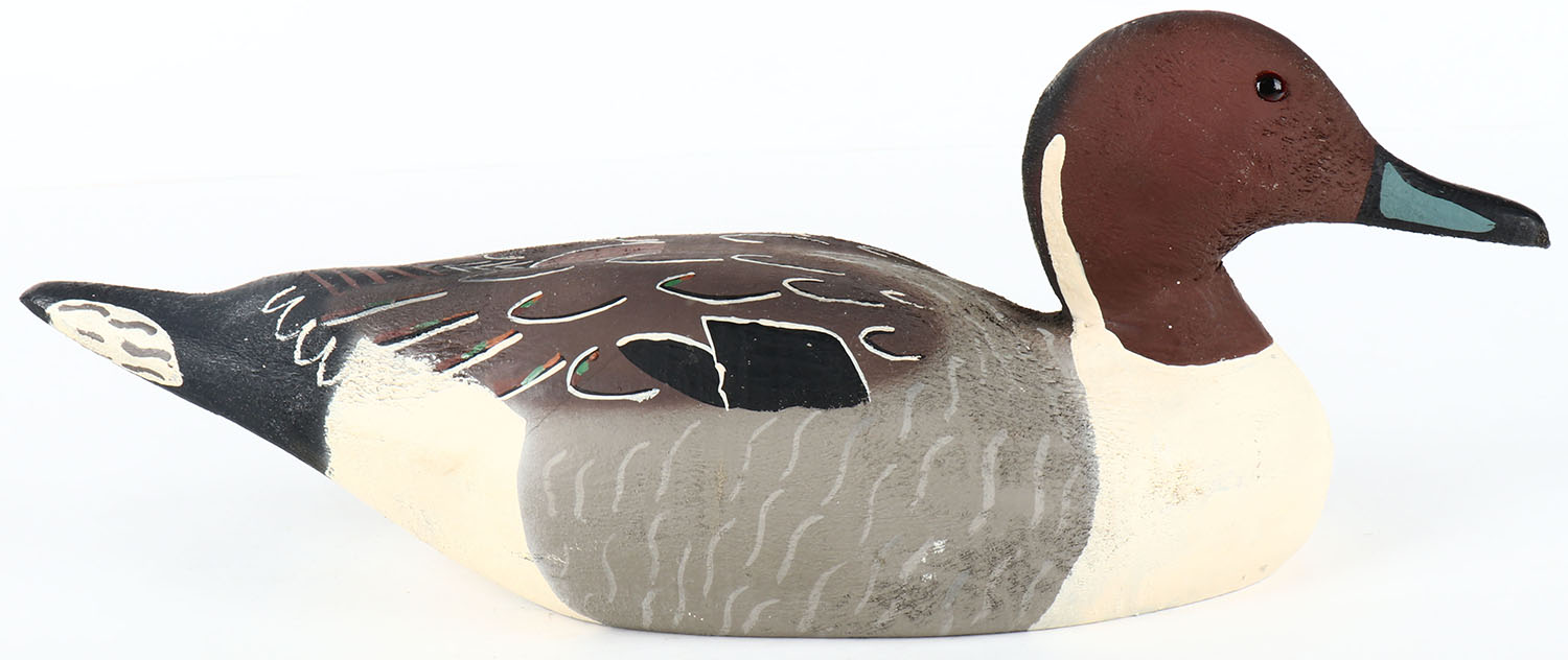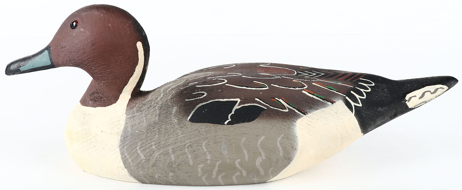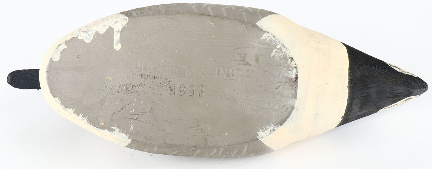 Pintail Drake by Herters Decoy Co., Waseca, MN, 1893 series, glass eyes, solid wood, original paint, structurally excellent, marked on bottom. Grade: Excellent ++ - Value: 50 to 250