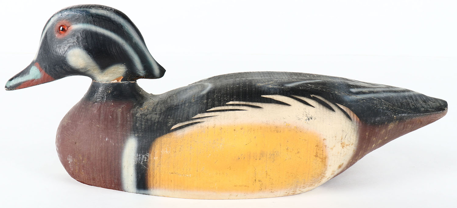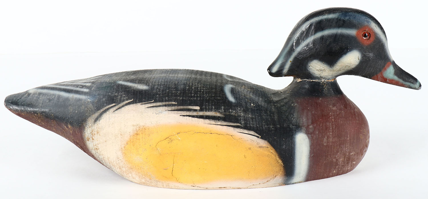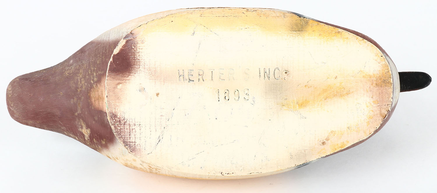 Woodduck Drake by Herters Decoy Co., Waseca, MN, 1893 series, glass eyes, solid wood, original paint, structurally excellent, marked on bottom. Grade: Excellent ++ - Value: 50 to 200
