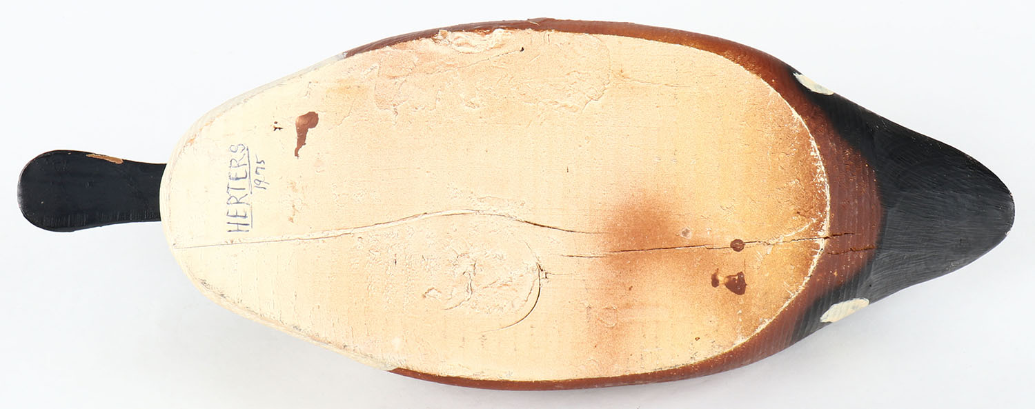 Shoveler Drake by Herters Decoy Co., Waseca, MN, 1893 series, glass eyes, solid wood, original paint, structurally excellent, unmarked on bottom. Grade: Excellent ++ - Value: 70 to 225