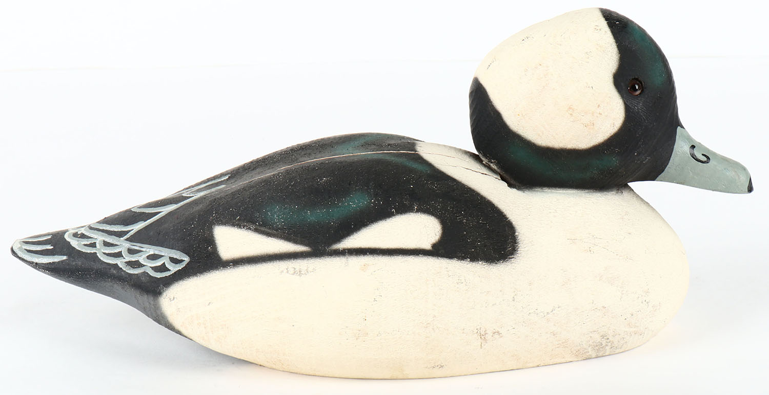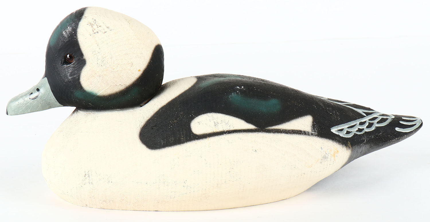 Bufflehead Drake by Herters Decoy Co., Waseca, MN, 1893 series, glass eyes, solid wood, original paint, structurally excellent, marked on bottom. Grade: Excellent - Value: 50 to 100