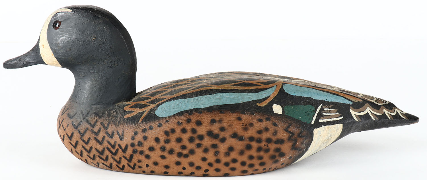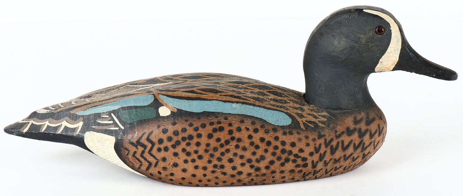 Bluewing Teal Drake by Herters Decoy Co., Waseca, MN, 1893 series, glass eyes, solid wood, original paint, structurally excellent, unmarked on bottom. Grade: Excellent ++ - Value: 40 to 150