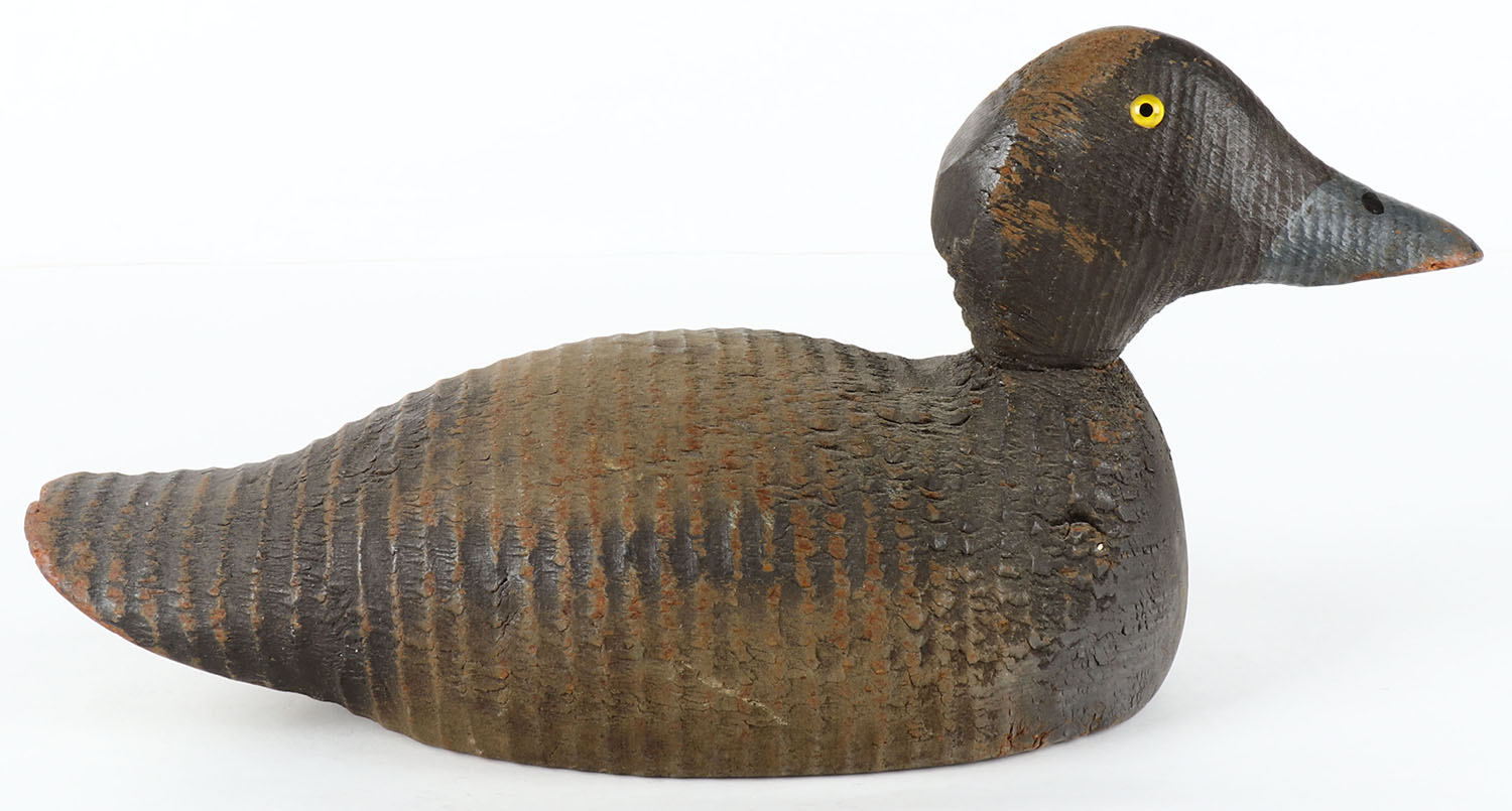 Bluebill Drake by ?? Factory lathed wood decoy, GE, hollwo wood, original paint, 14'' OAL. Grade: Excellent - Value: 10 to 30