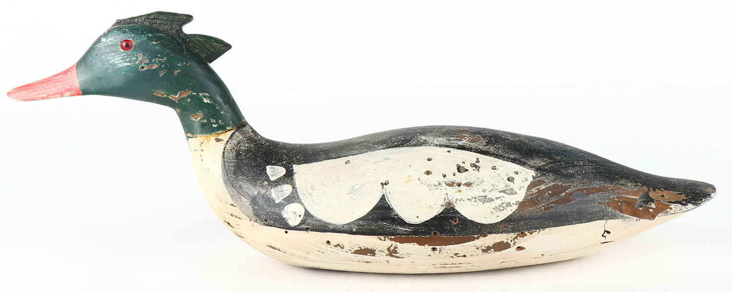 Swimming Hooded Merganser by unknown maker, GE, solid wood, original contemporary distressed paint, shows wear & bird shot, 20'' OAL. Grade: Very Good + - Value: 10 to 30