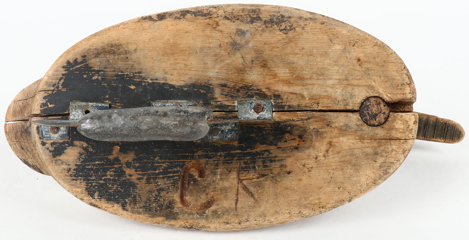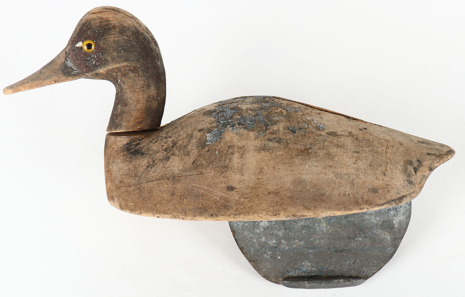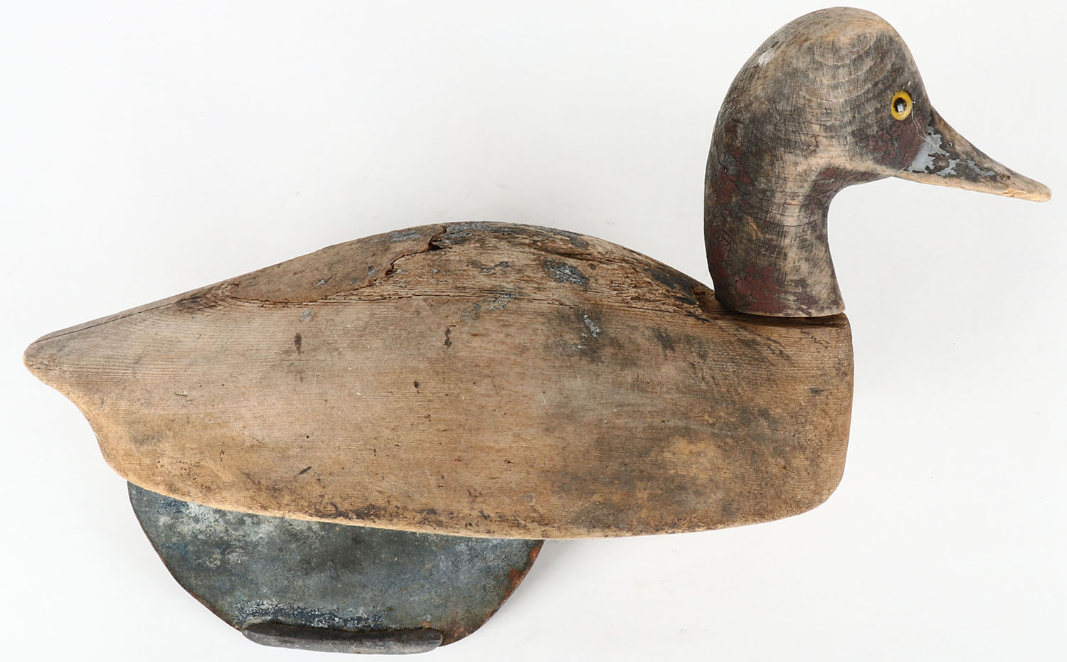 Early Pintail Drake by unknown maker, GE, solid wood, worn original paint, has large metal keel, head is attaches & will not come off but loose, 14'' OAL. Grade: Good - Value: 10 to 100