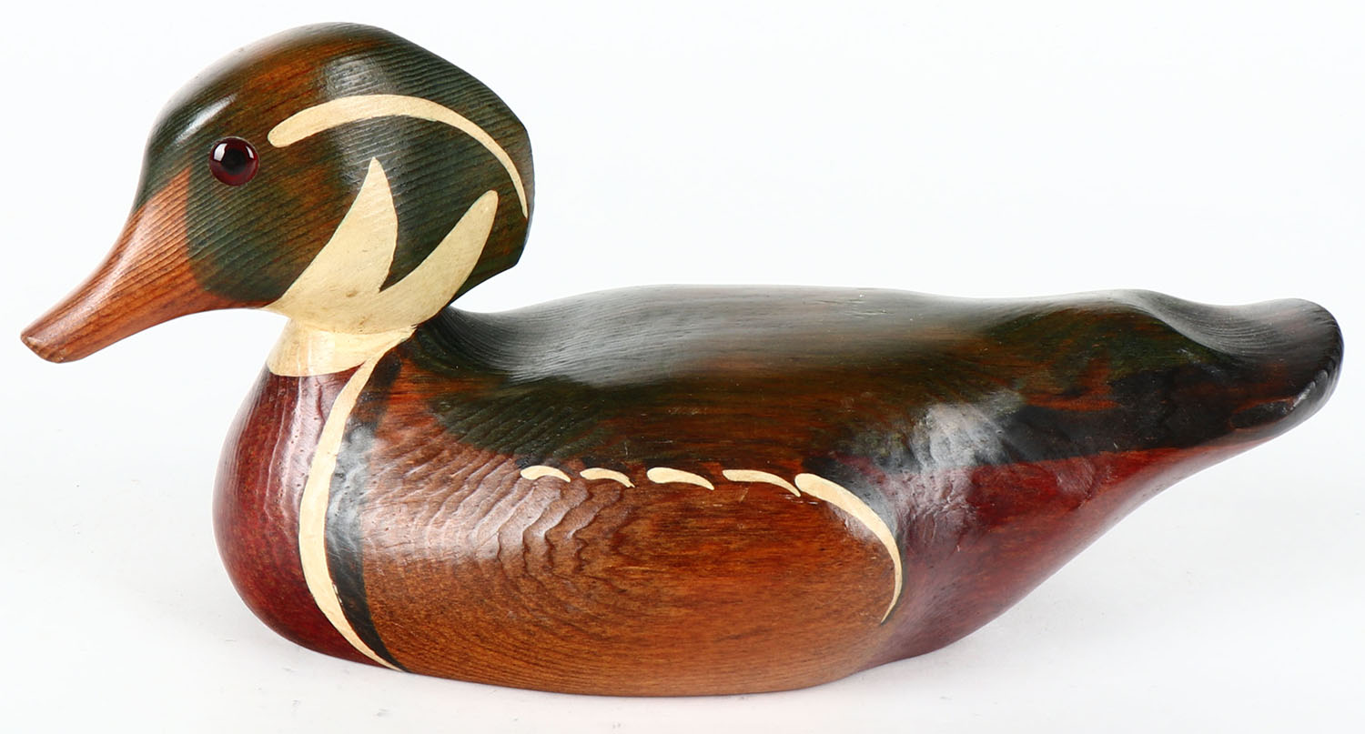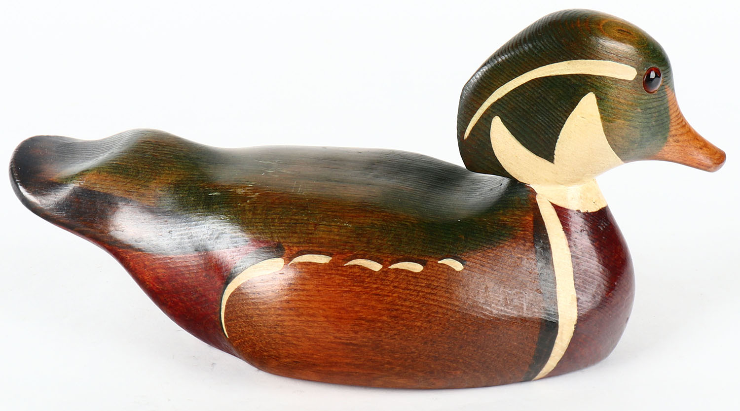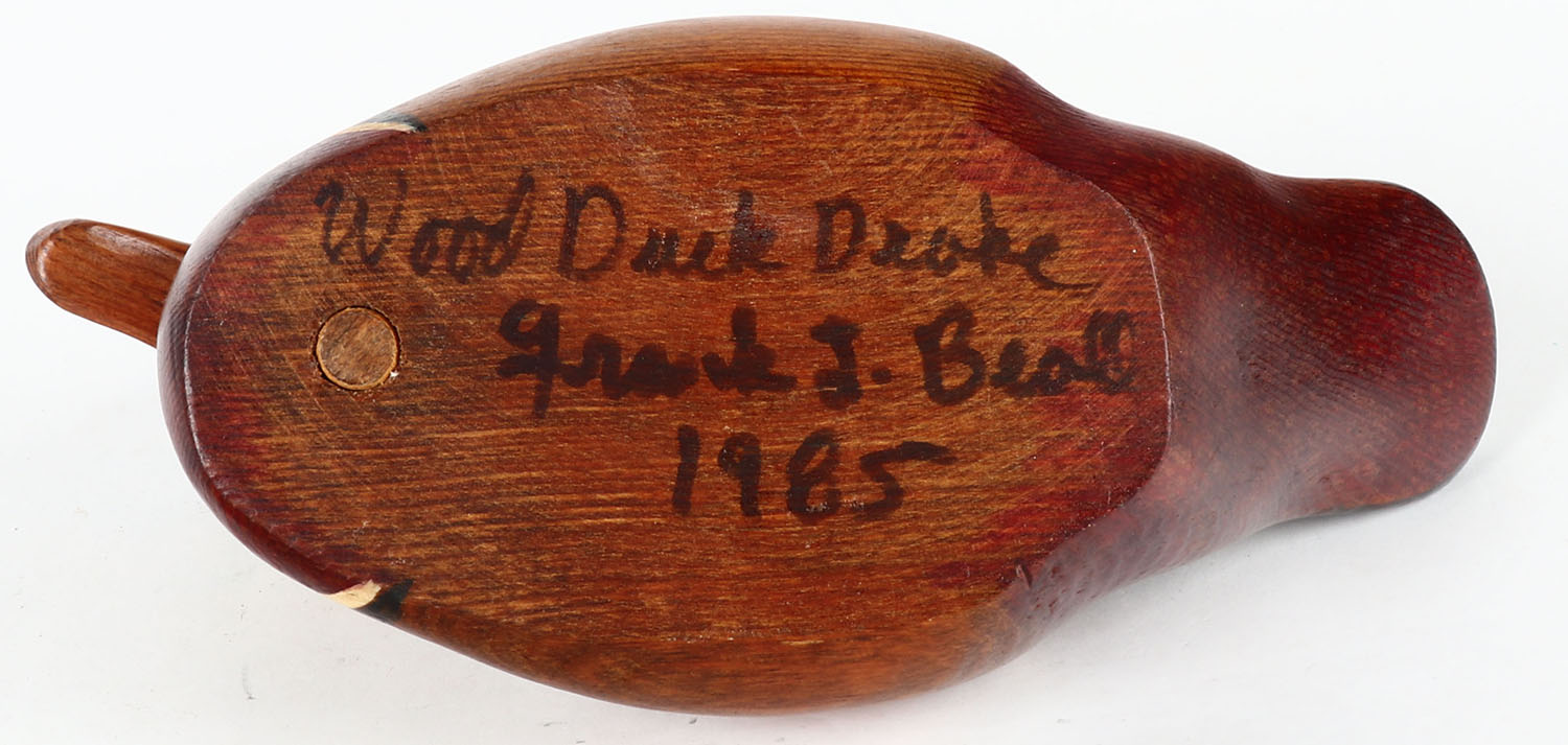 Woodduck Drake by Frank J. Beall, GE, solid wood, mint original stain, signed on bottom, 10'' OAL. Grade: Excellent ++ - Value: 20 to 60