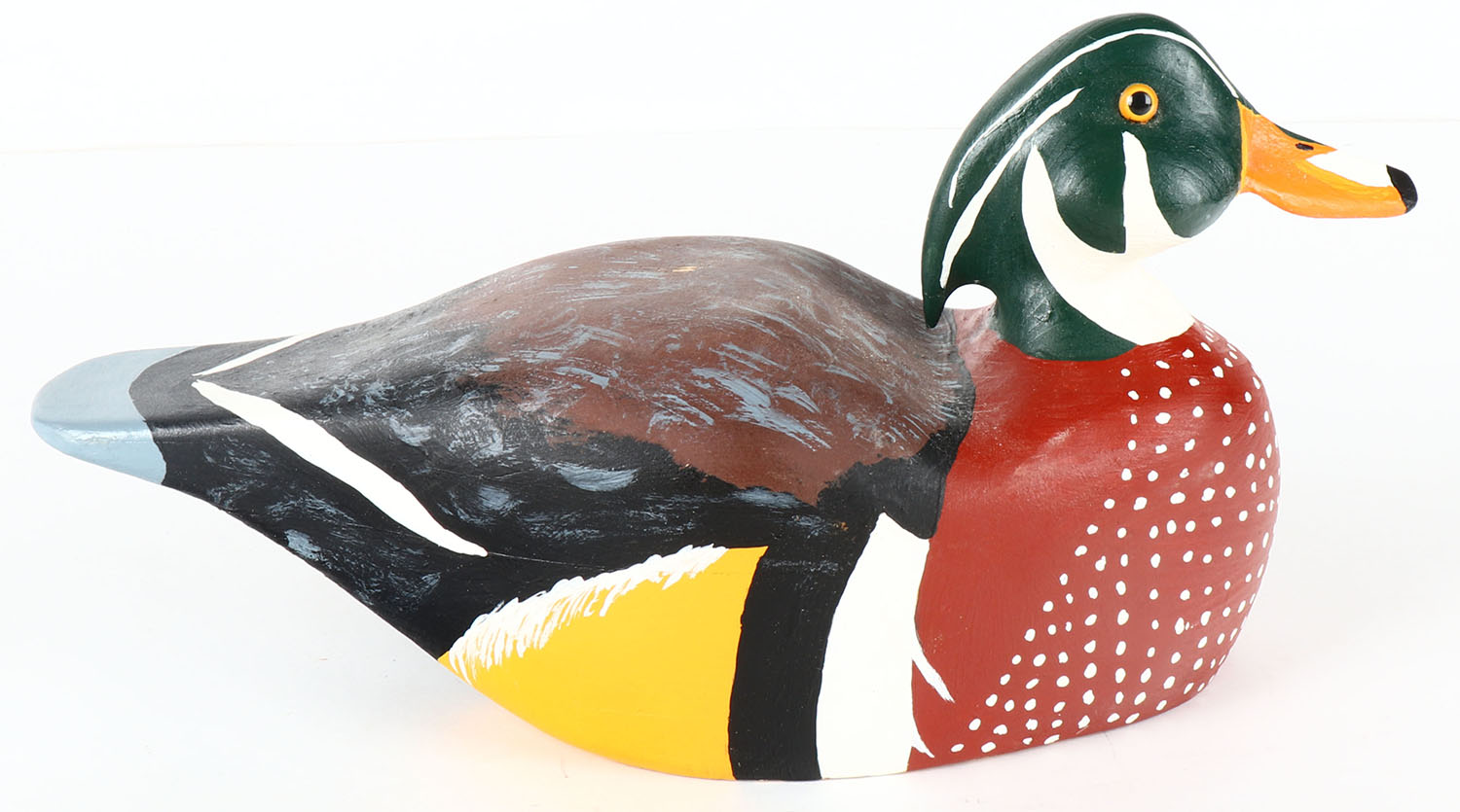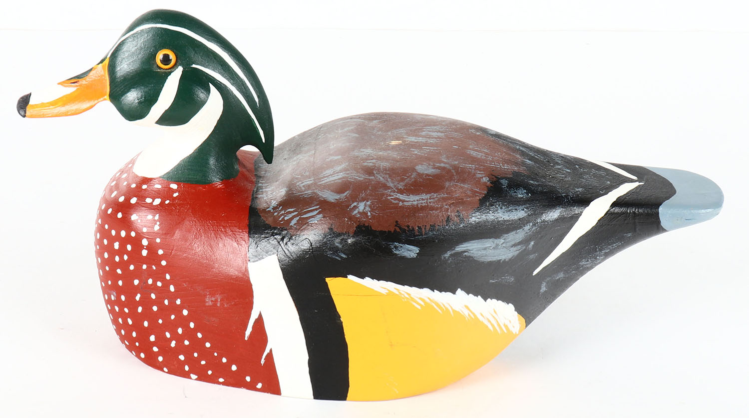 Woodduck Drake by unknown maker, GE, solid wood, original paint, 13'' OAL. Grade: Excellent ++ - Value: 10 to 40