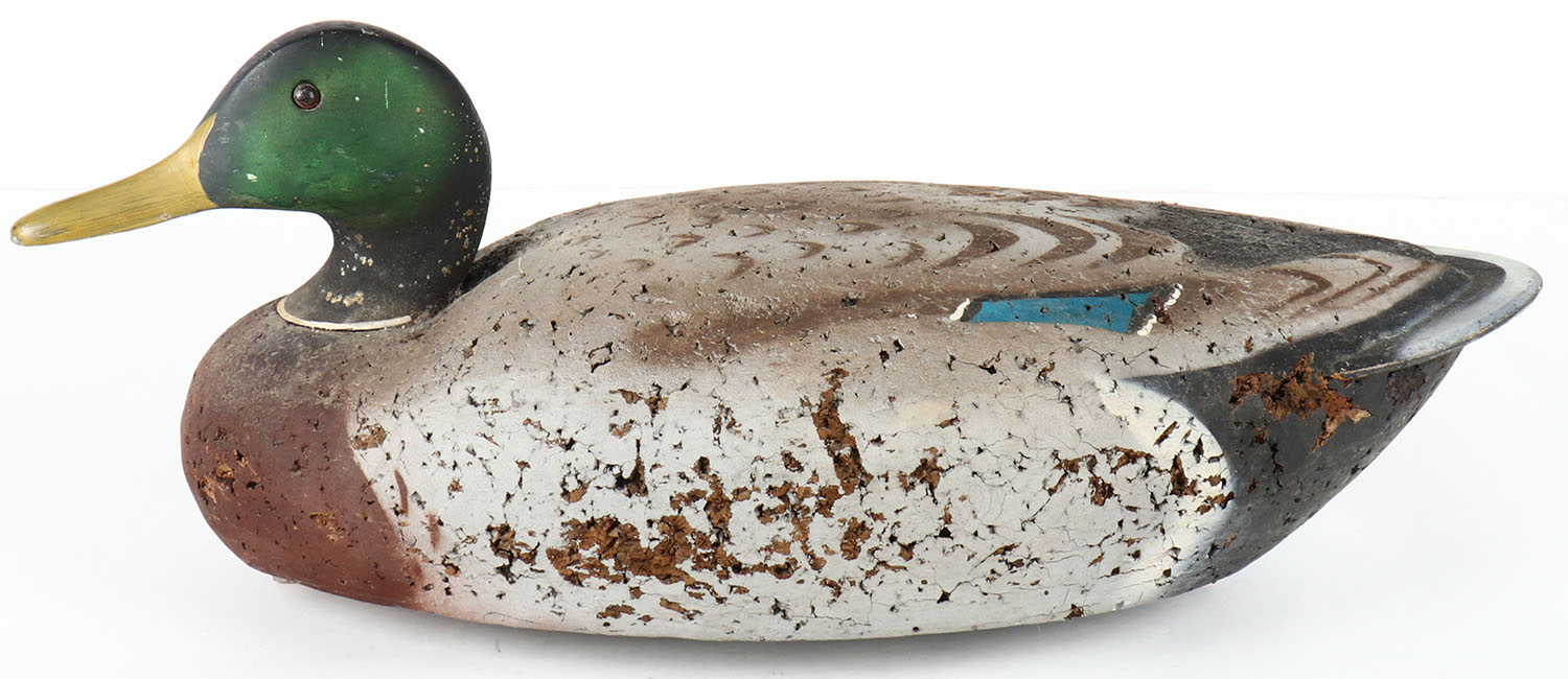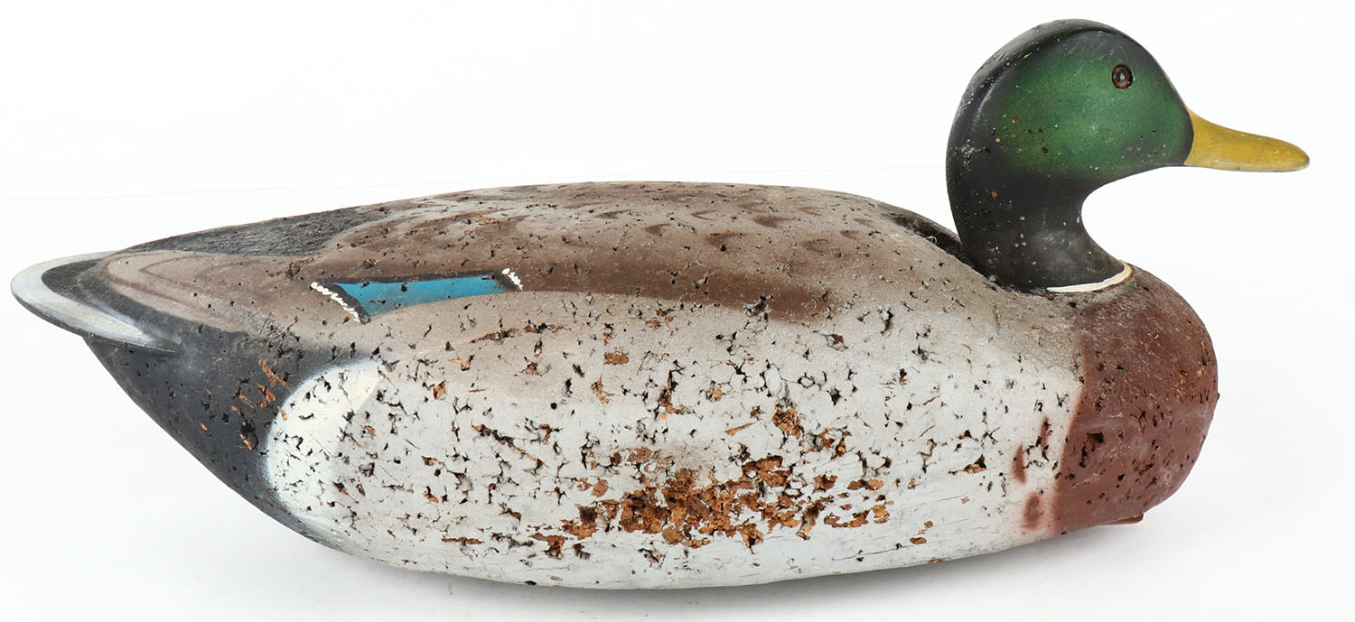 Mallard Drake by LL Bean, unmarked on keel, glass eyes, solid cork body, wood head, original paint, structurally excellent, 21'' OAL. Grade: Excellent - Value: 20 to 50