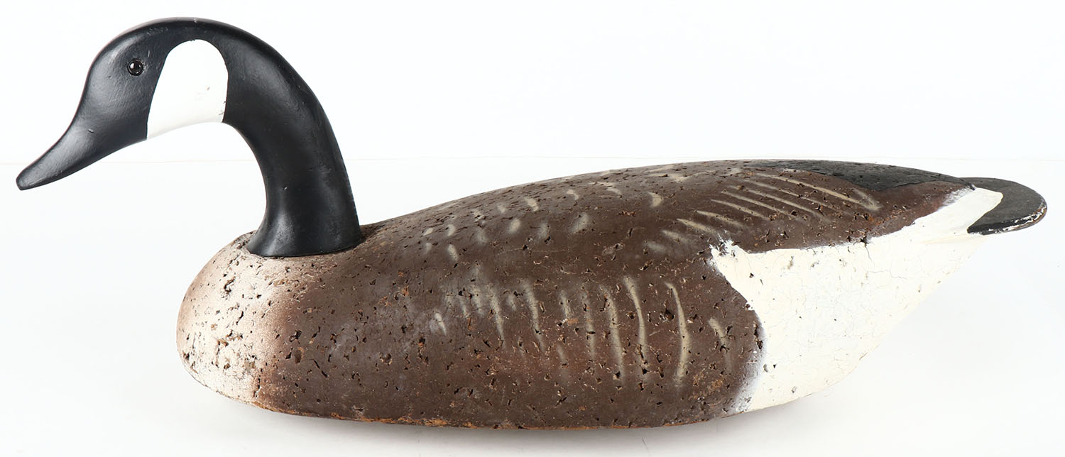 Canada Goose by LL Bean, unmarked on keel, glass eyes, solid cork body, wood head, original paint, structurally excellent, 25'' OAL. Grade: Excellent ++ - Value: 10 to 50