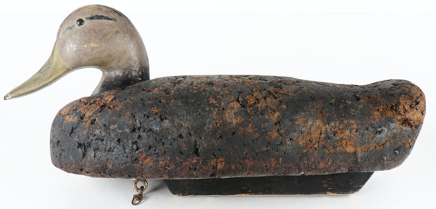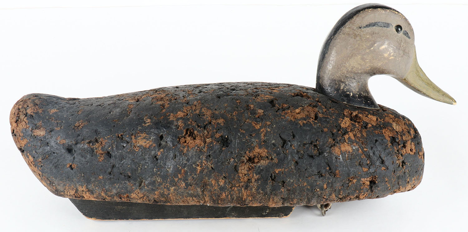 Black Duck by unknown maker, glass eyes, solid cork body, wood head, original paint, structurally excellent, 18'' OAL. Grade: Very Good ++ - Value: 10 to 50