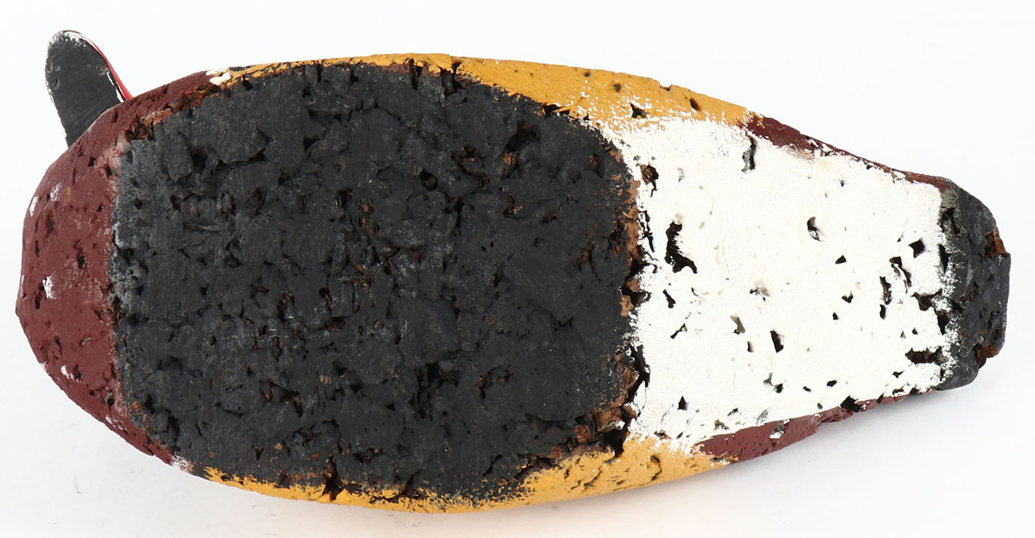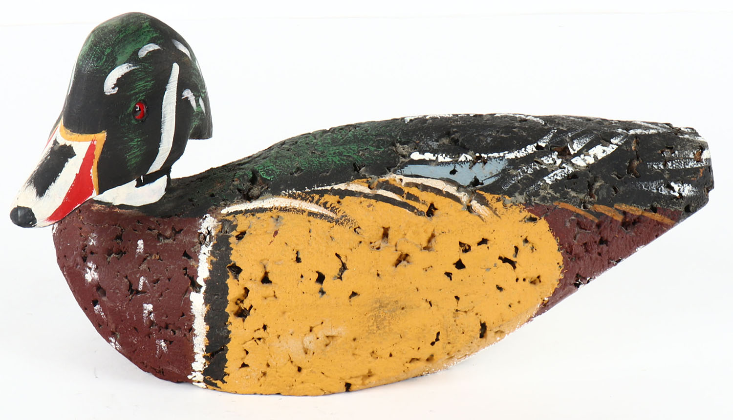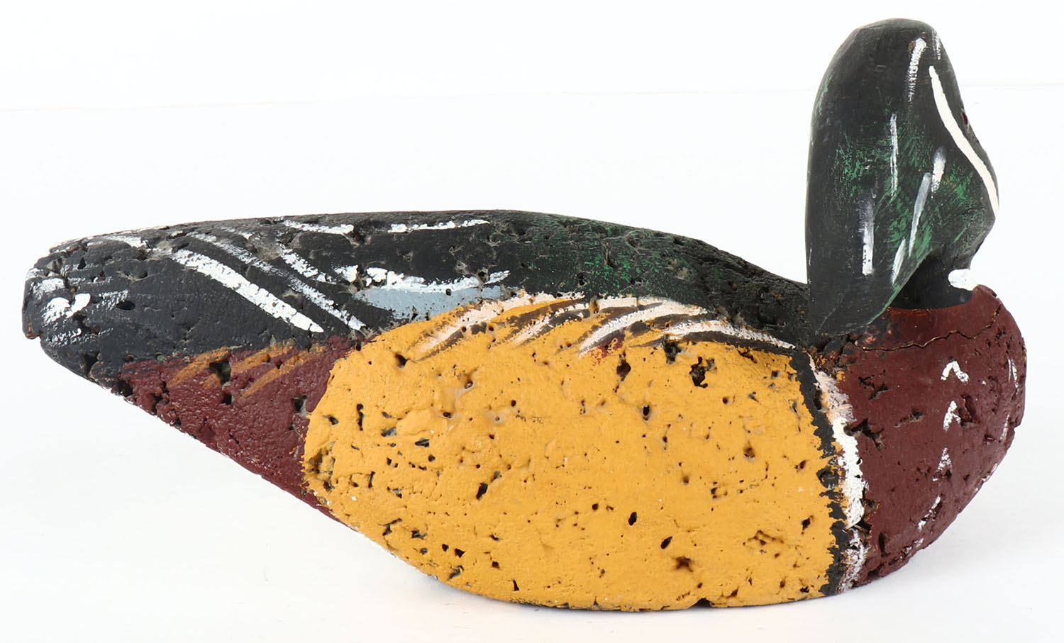 Woodduck Drake by unknown maker, glass eyes, solid cork body, wood head, original paint, structurally excellent, 11'' OAL. Grade: Excellent - Value: 10 to 30