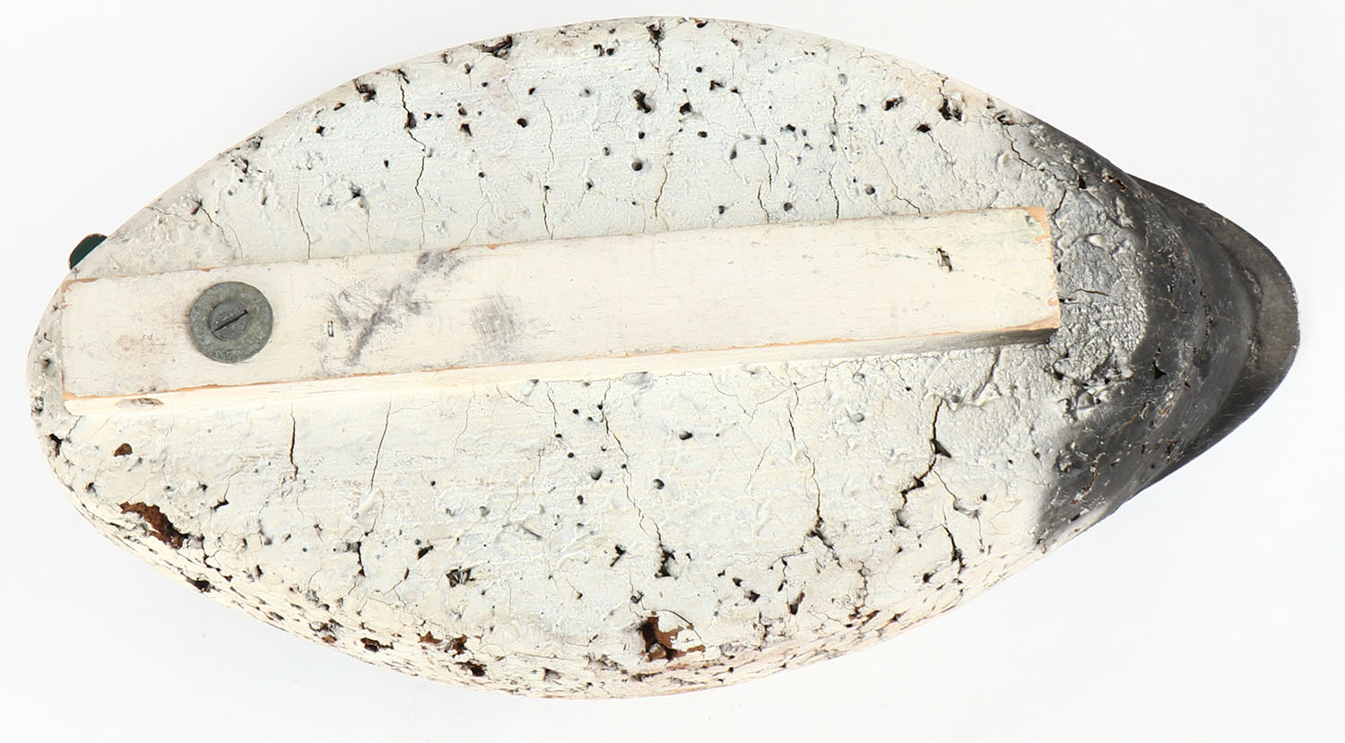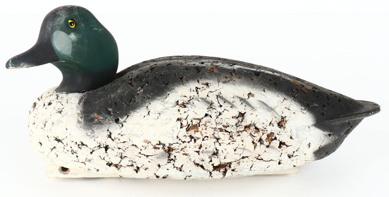 Goldeneye Drake by L.L. Bean, umarked keel, glass eyes, solid cork body, wood head, original paint, structurally excellent, 16'' OAL. Grade: Excellent - Value: 10 to 50
