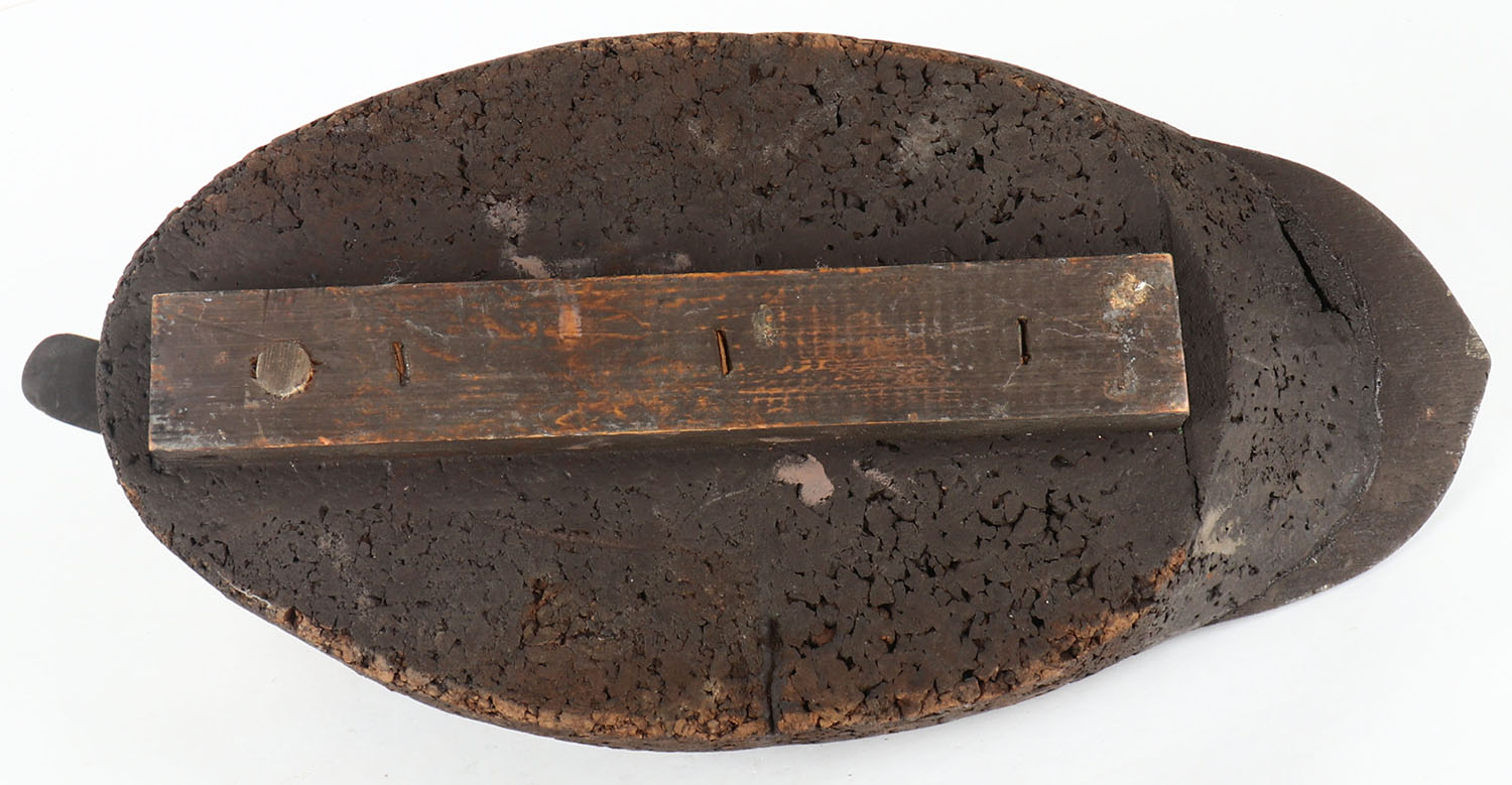 Black Duck by unknown maker, glass eyes, solid cork body, wood head, original paint, structurally excellent, 16'' OAL. Grade: Excellent ++ - Value: 10 to 50