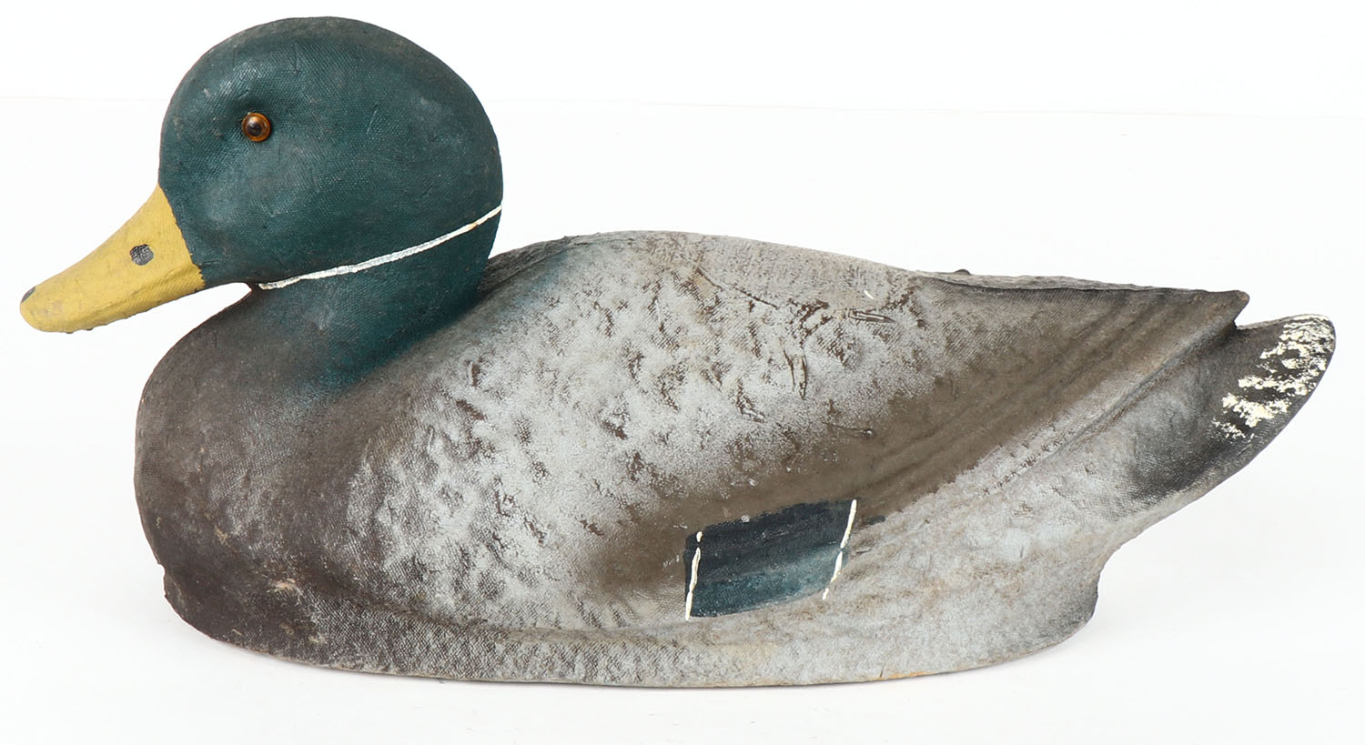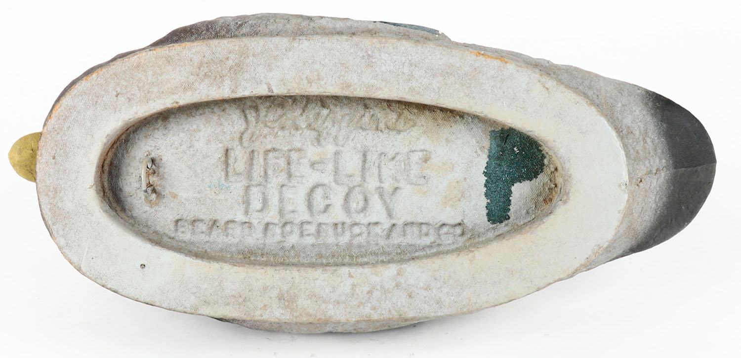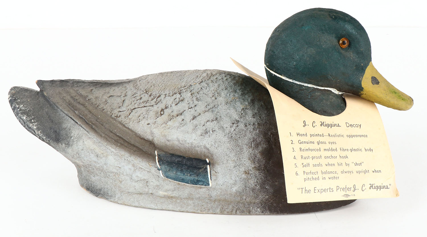 Mallard Drake by J.C. Higgins, Paper Mache', Model Life Like, GE, original paint, has original paper color with info about decoy. Grade: Excellent + - Value: 2 to 30