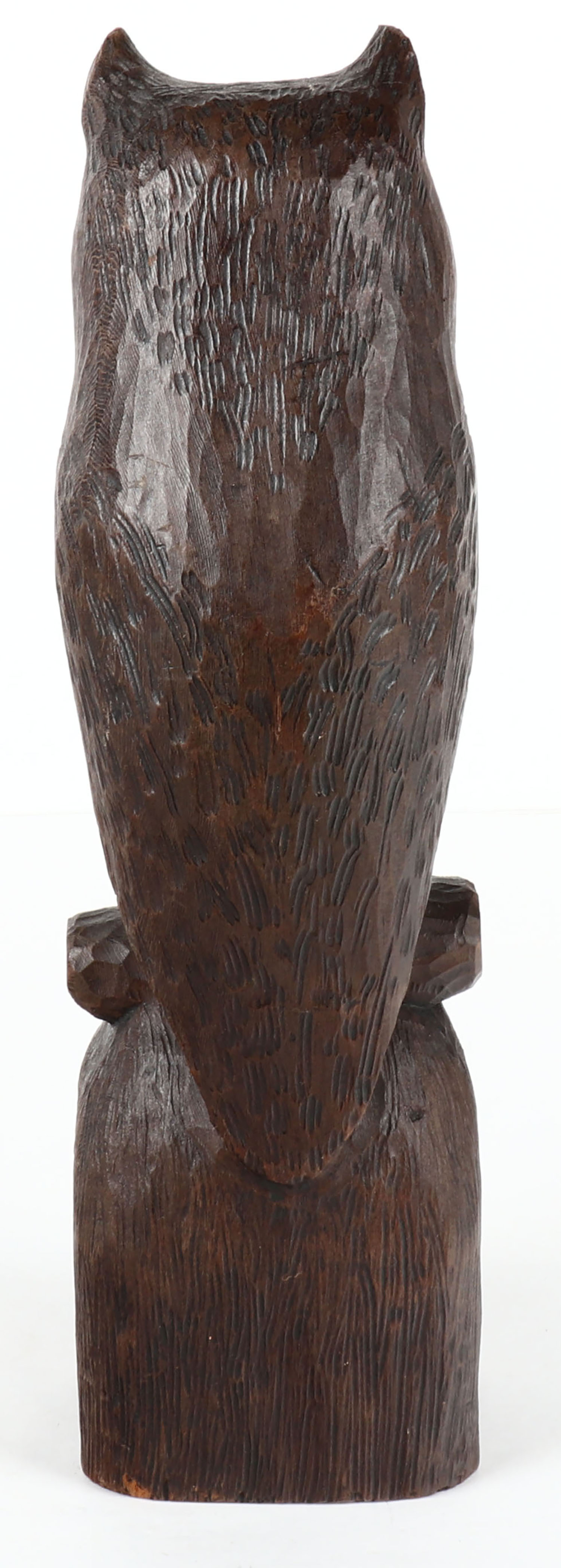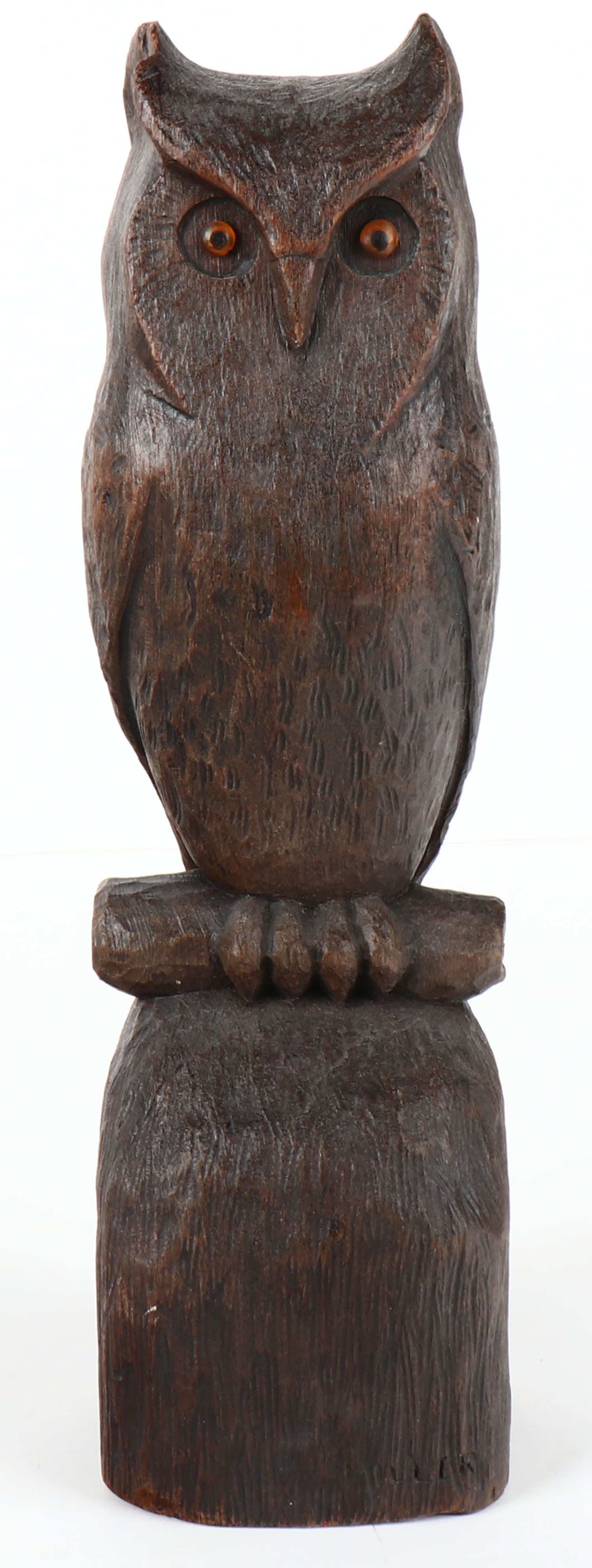 Owl on fixed stand by Miller, GE, solid wood, nice feather detail, 13 1/2'' tall. Grade: MINT - Value: 30 to 60