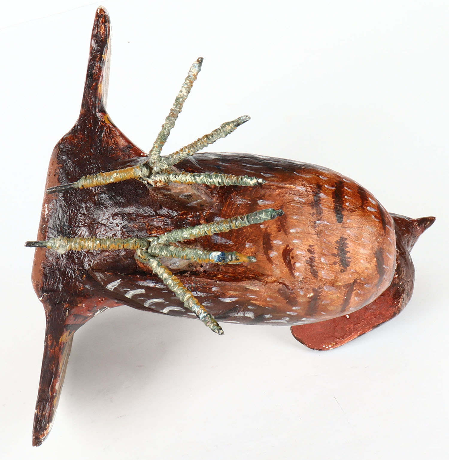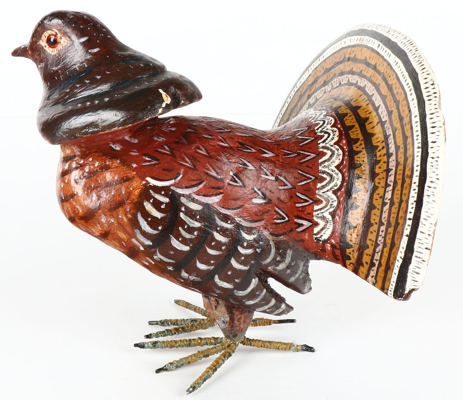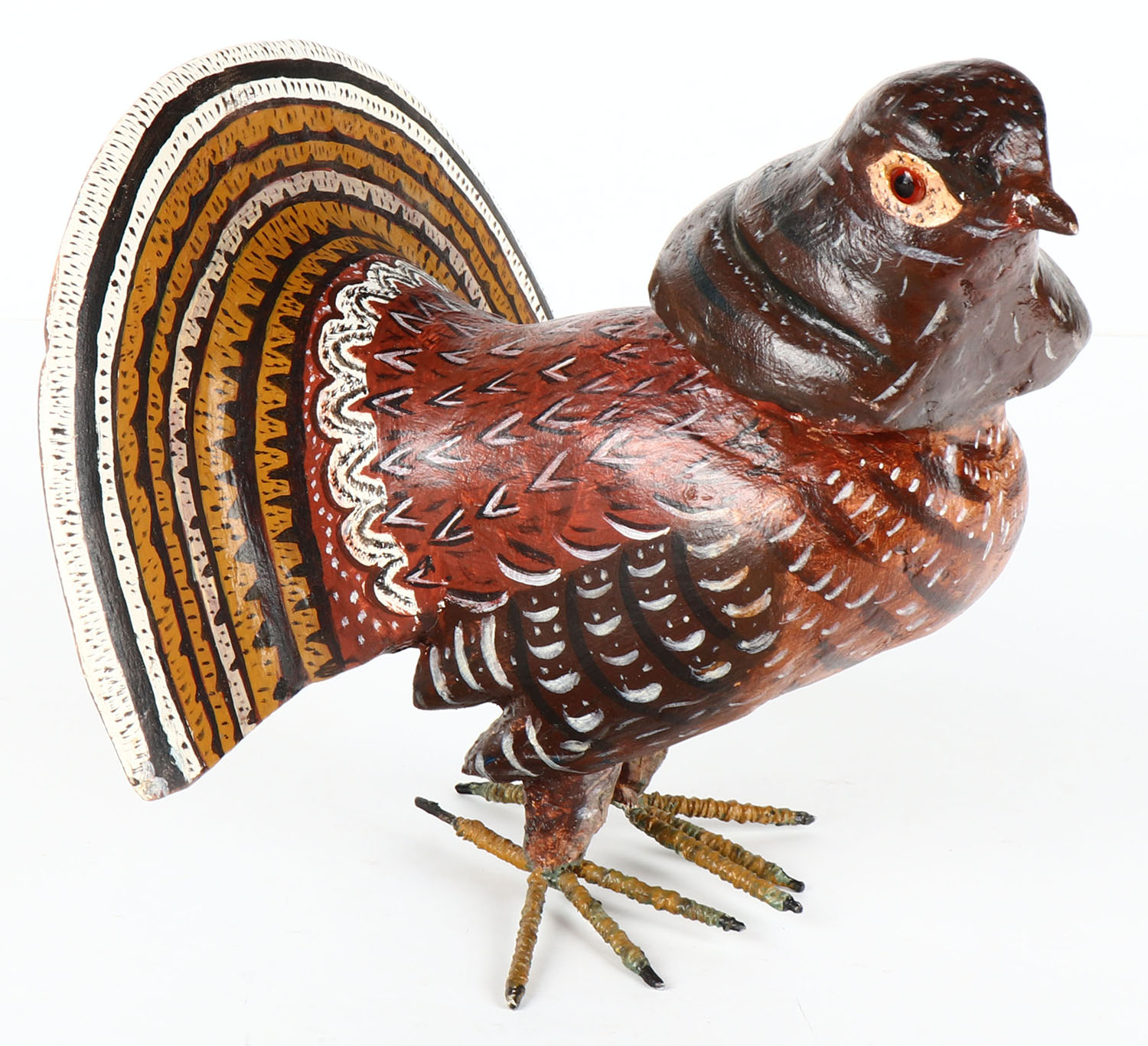 Ruffed Grouse in full plumage by unknown maker, GE, solid wood, original paint, 9'' OAL. Grade: Excellent - Value: 30 to 60