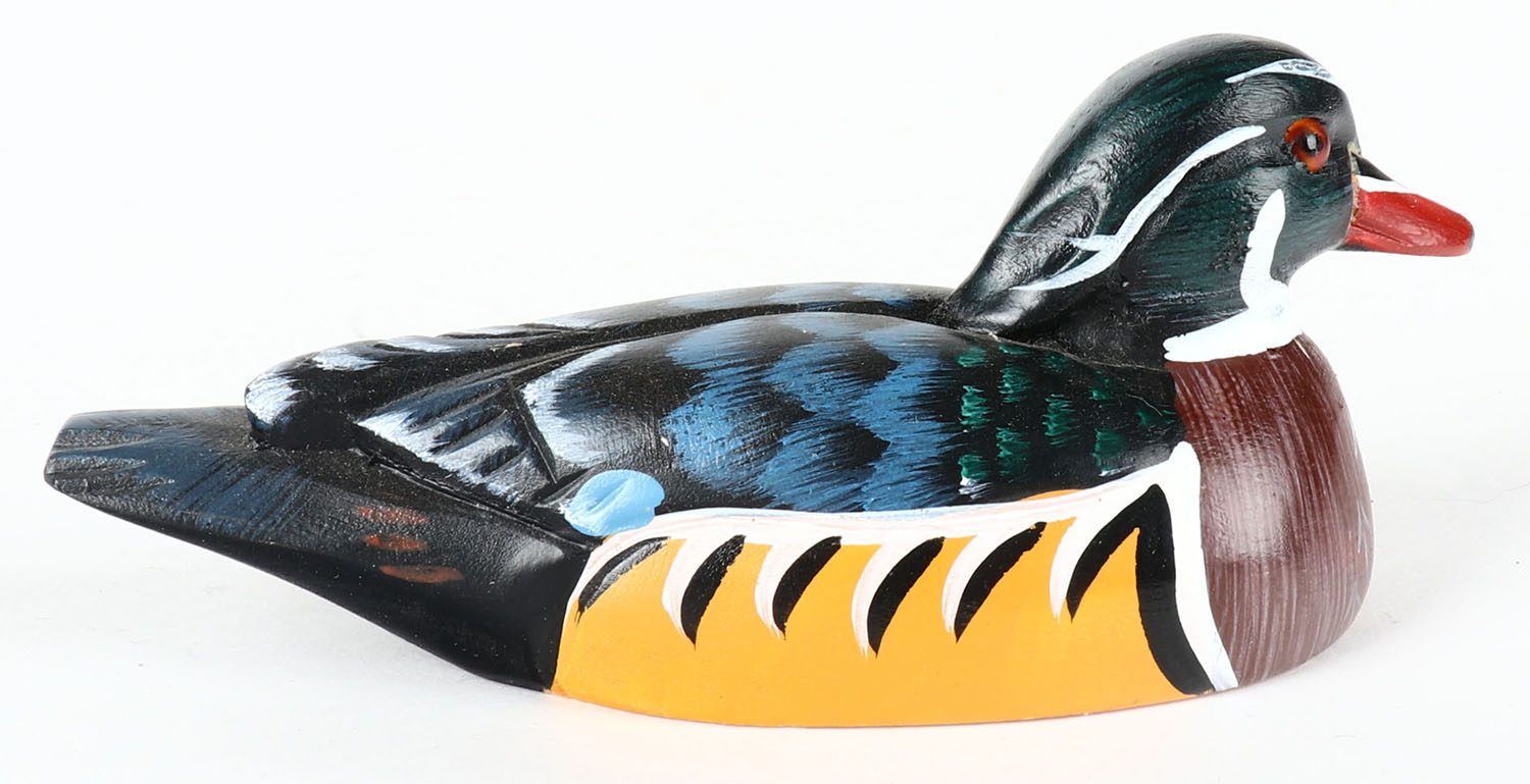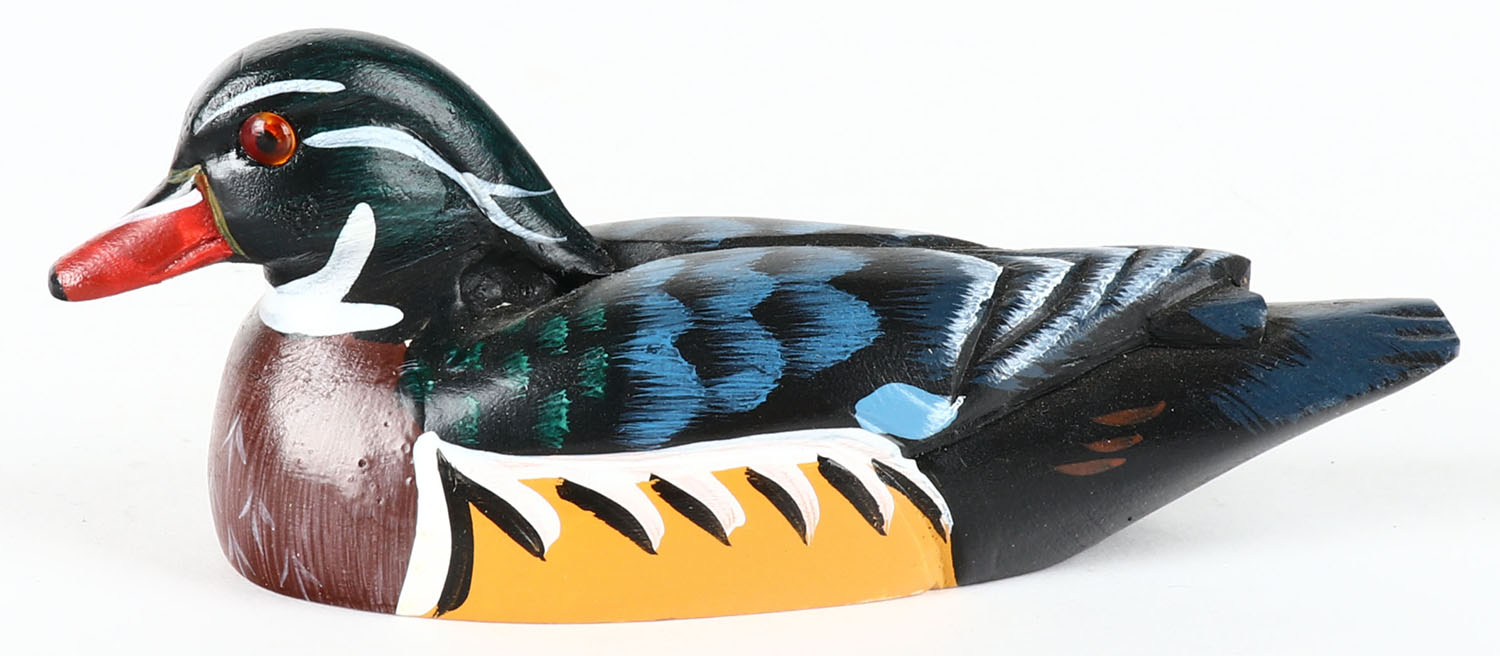 Miniature Woodduck Drake by unknonw maker, GE, solid wood, mint original paint, 5'' OAL. Grade: Excellent ++ - Value: 10 to 40