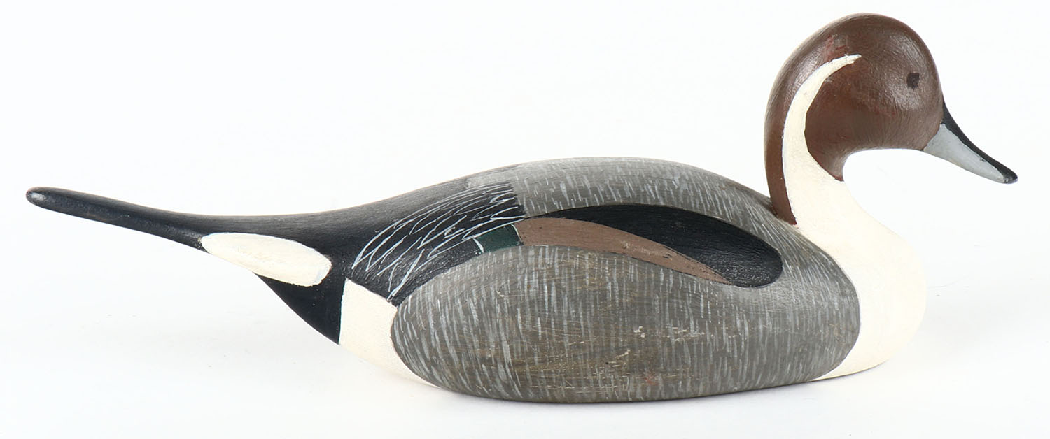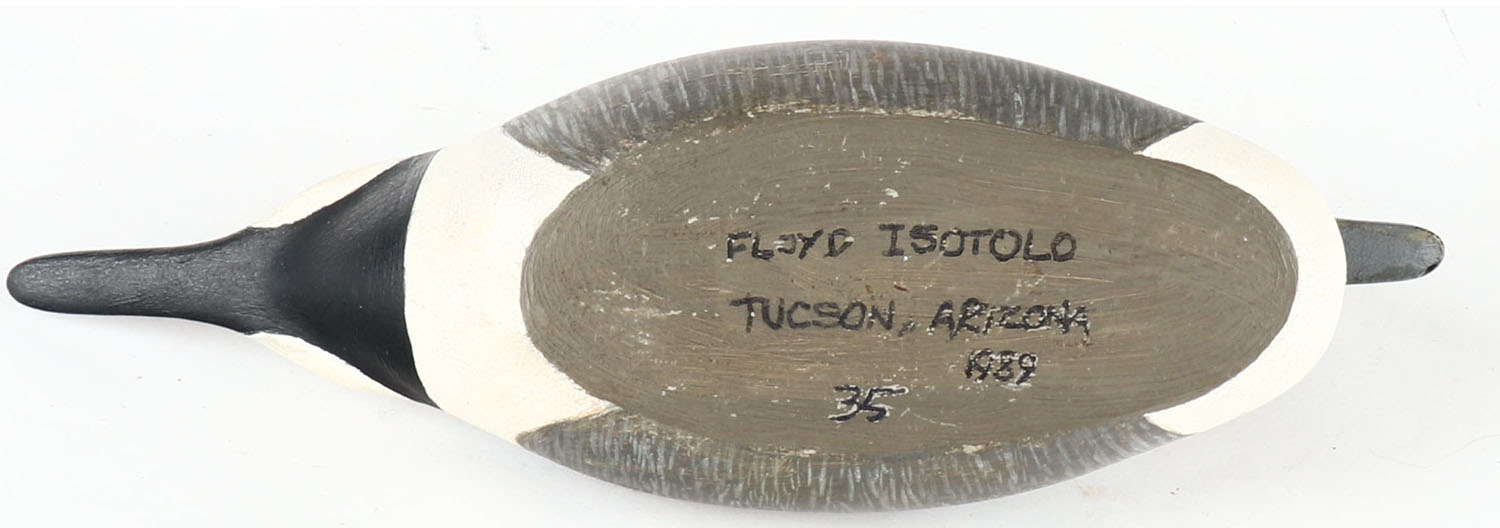 Miniature Pintial Drake by Floyd Isotolo, Tucson, AZ, PE, solid wood, mint original paint, signed on bottom, 6 1/2'' OAL. Grade: Excellent ++ - Value: 20 to 60