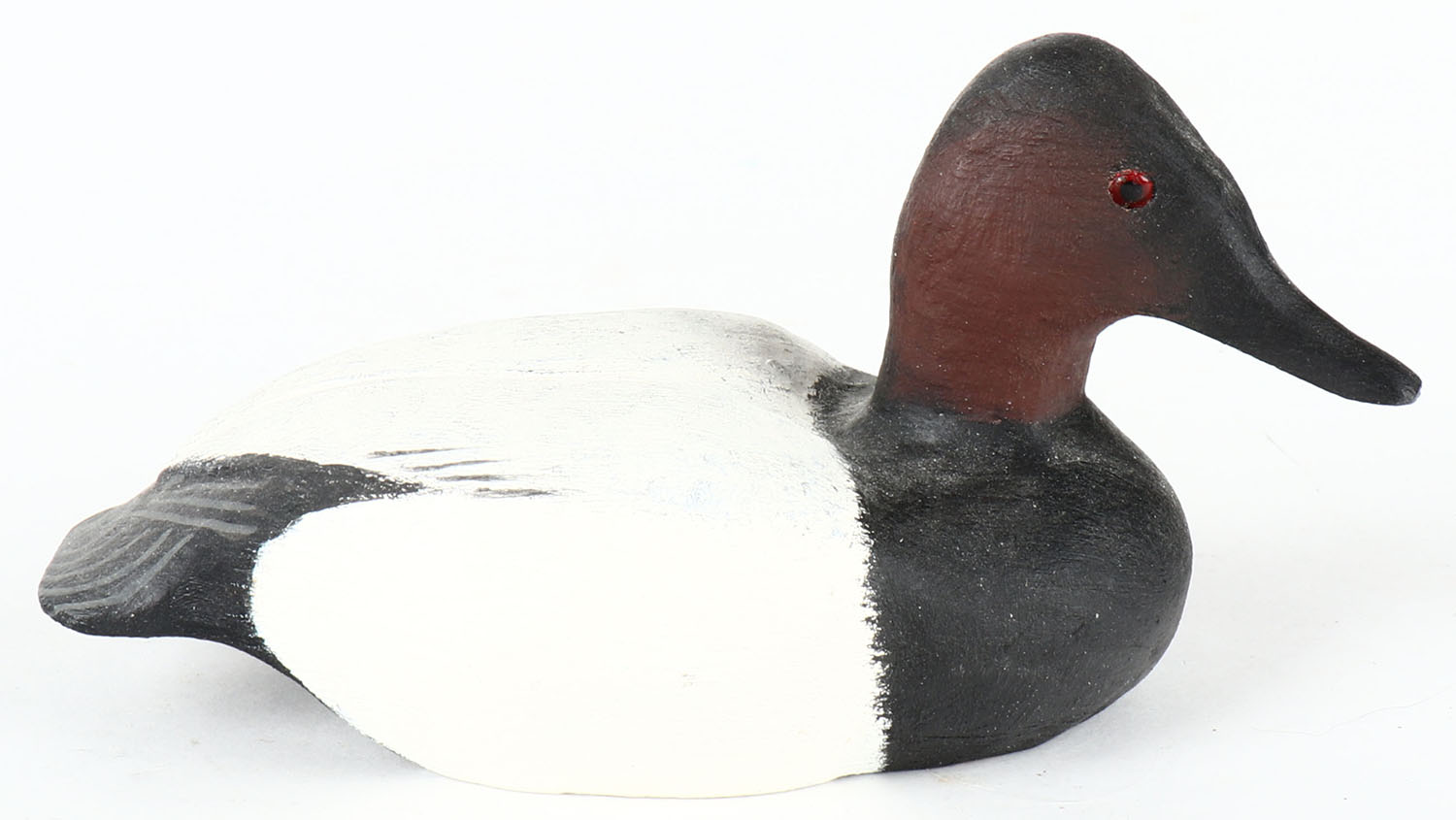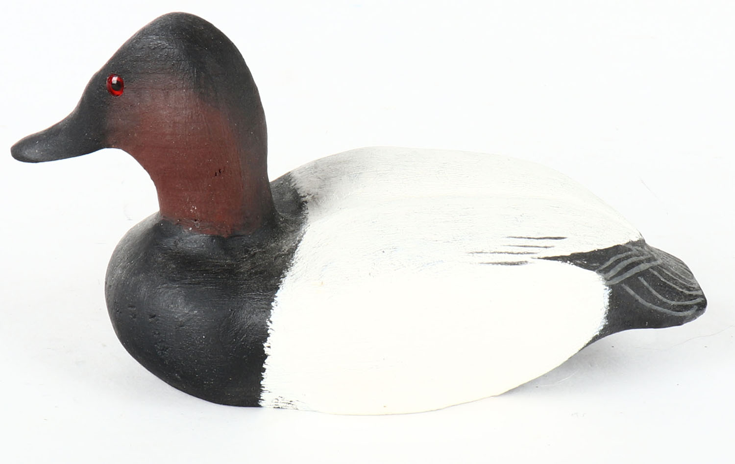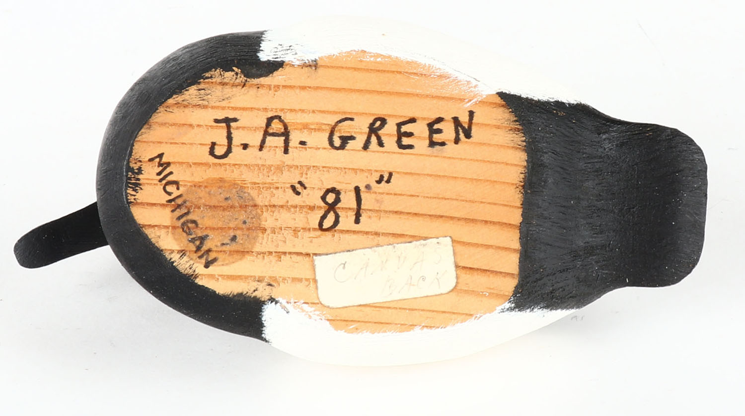 Miniature Canvasback Drake by J.A. Green, MI, GE, solid wood, mint original paint, signed on bottom, 5 1/2'' OAL. Grade: Excellent ++ - Value: 20 to 60