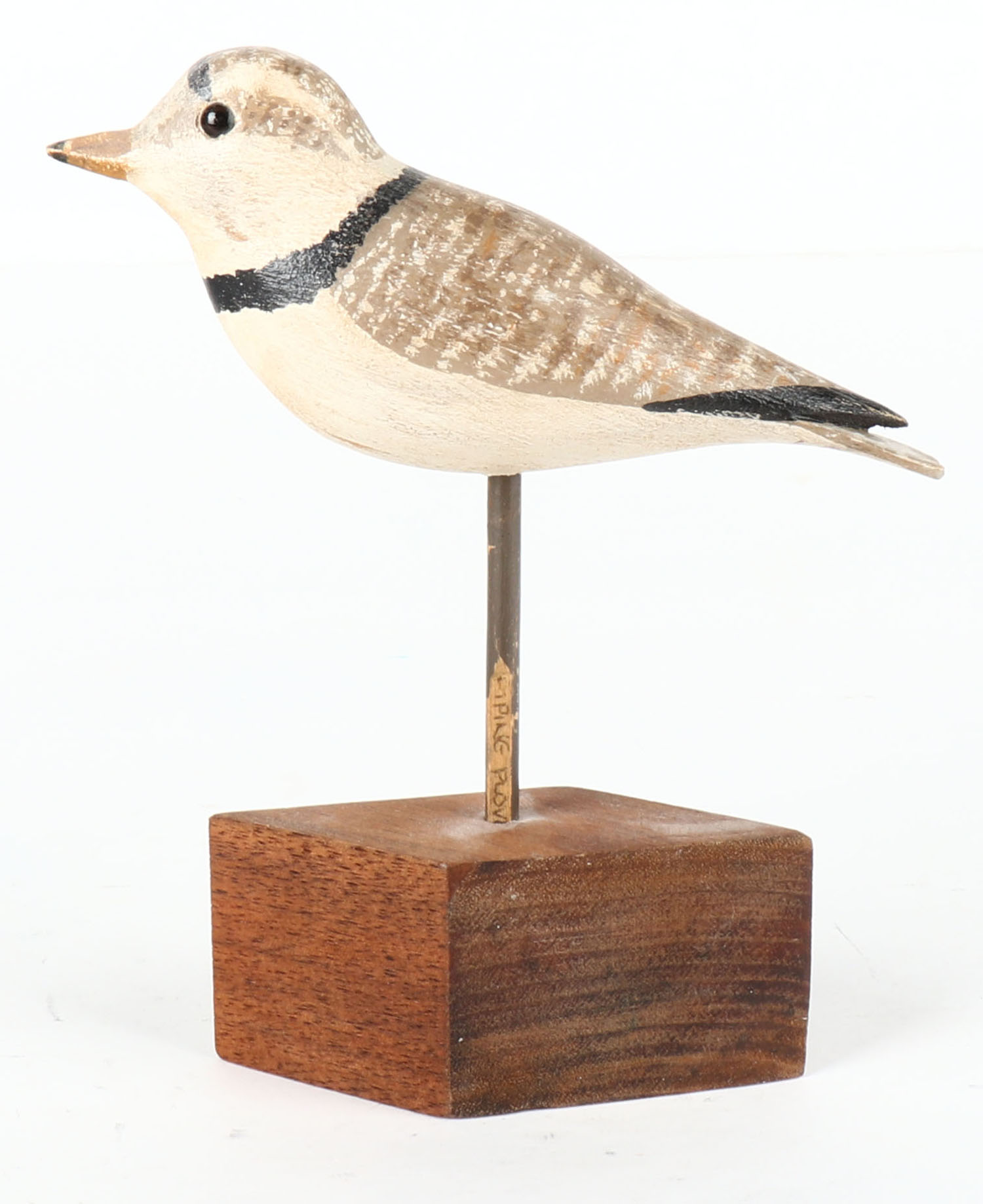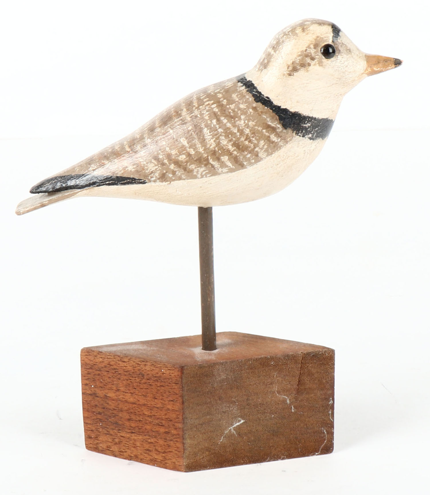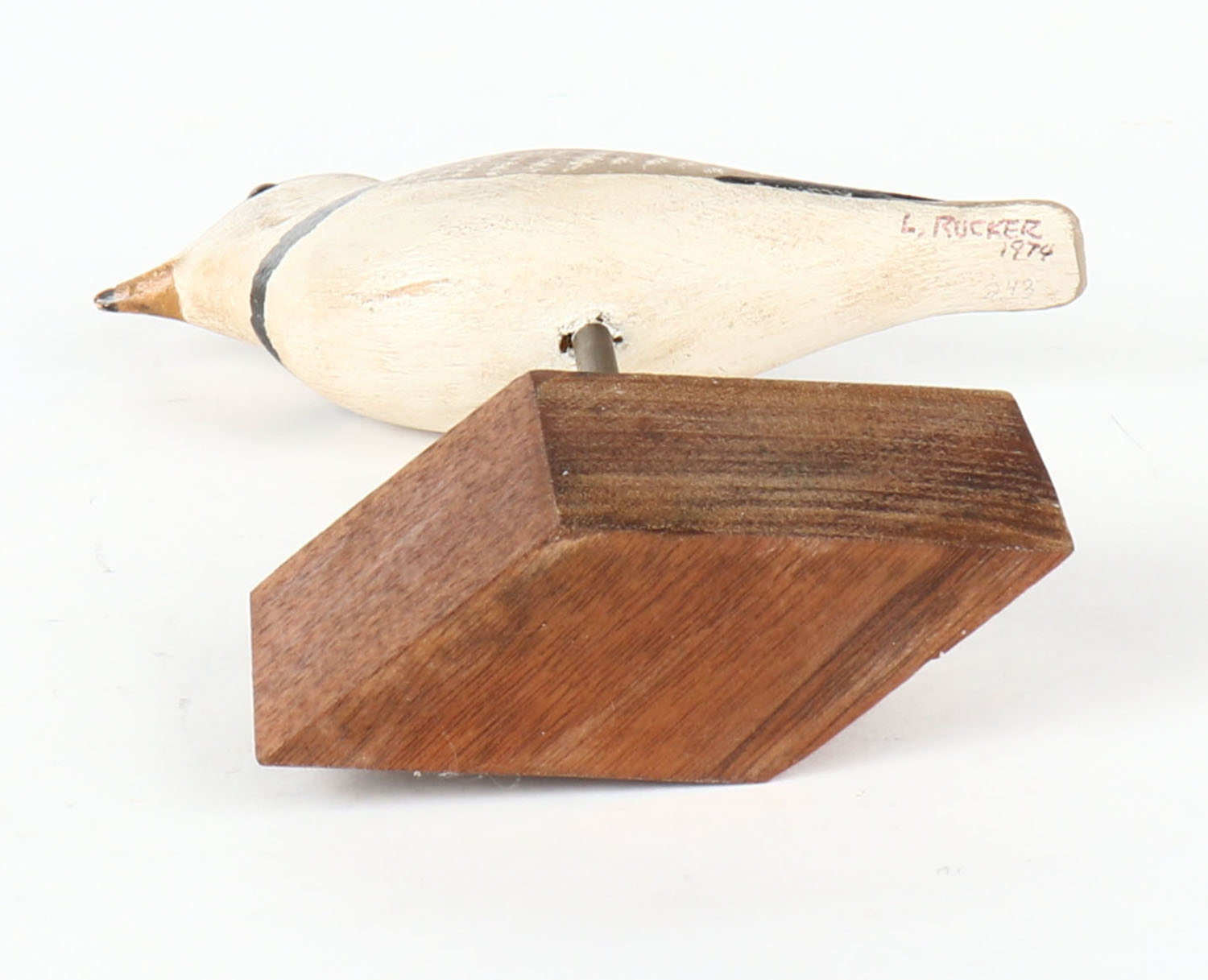 Miniature Shorebird by Larry Rucker, Renton, WA, GE, solid wood, mint original paint, signed on bottom with stand, 5'' OAL. Grade: Excellent ++ - Value: 30 to 90