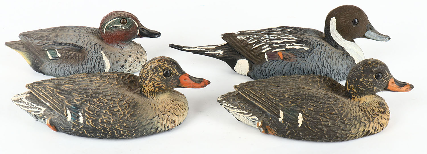 Lot of 4 Salesman Sample Mallard, Pintial & Greenwing Teal decoys by Sport Plast??, PE, plastic, all original paint, 6 1/4'' OAL. Grade: Excellent - Value: 30 to 100