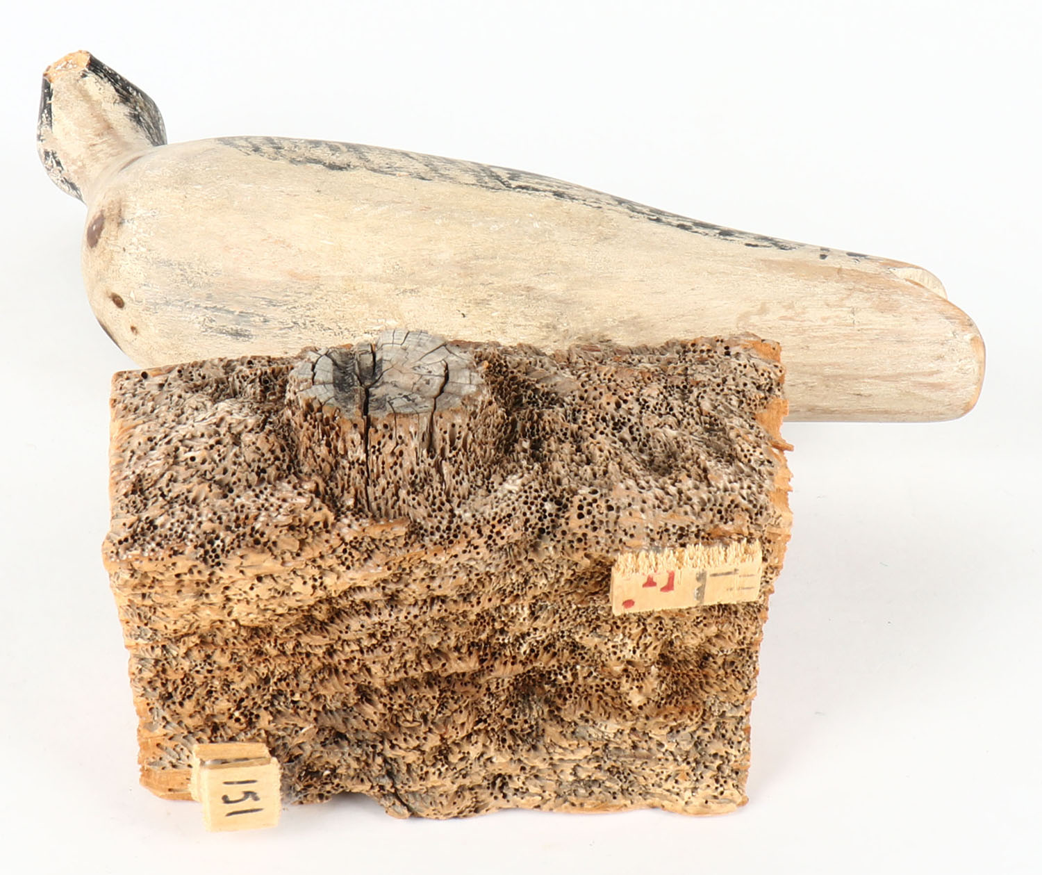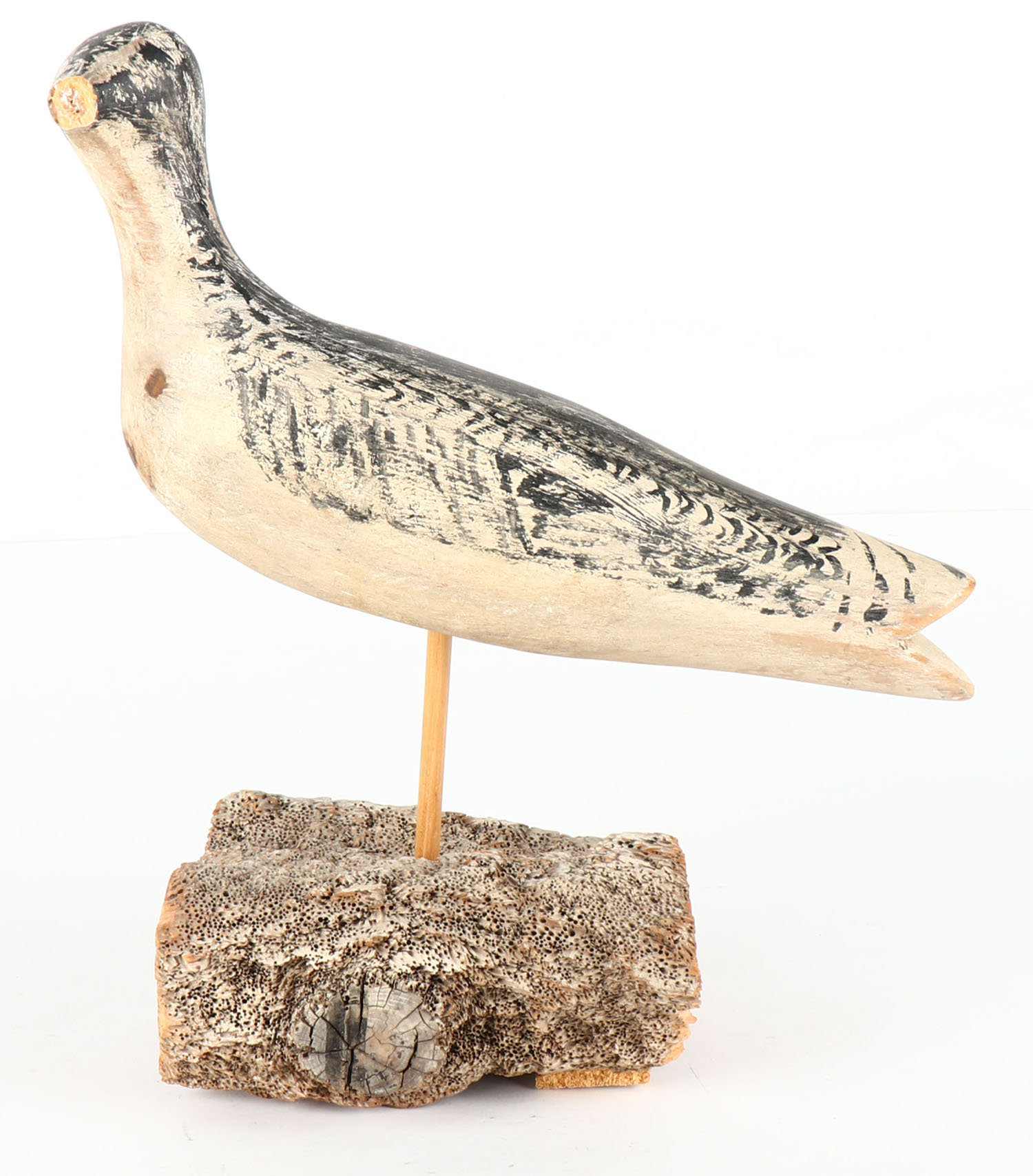 Shorebird by unknown carver on stand, no eyes, brocken bill, original paint, 10'' OAL. Grade: Very Good - Value: 10 to 60