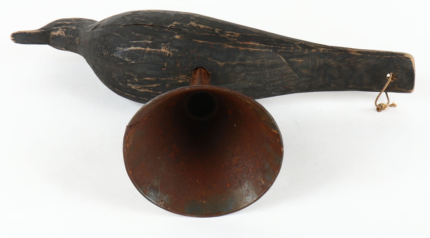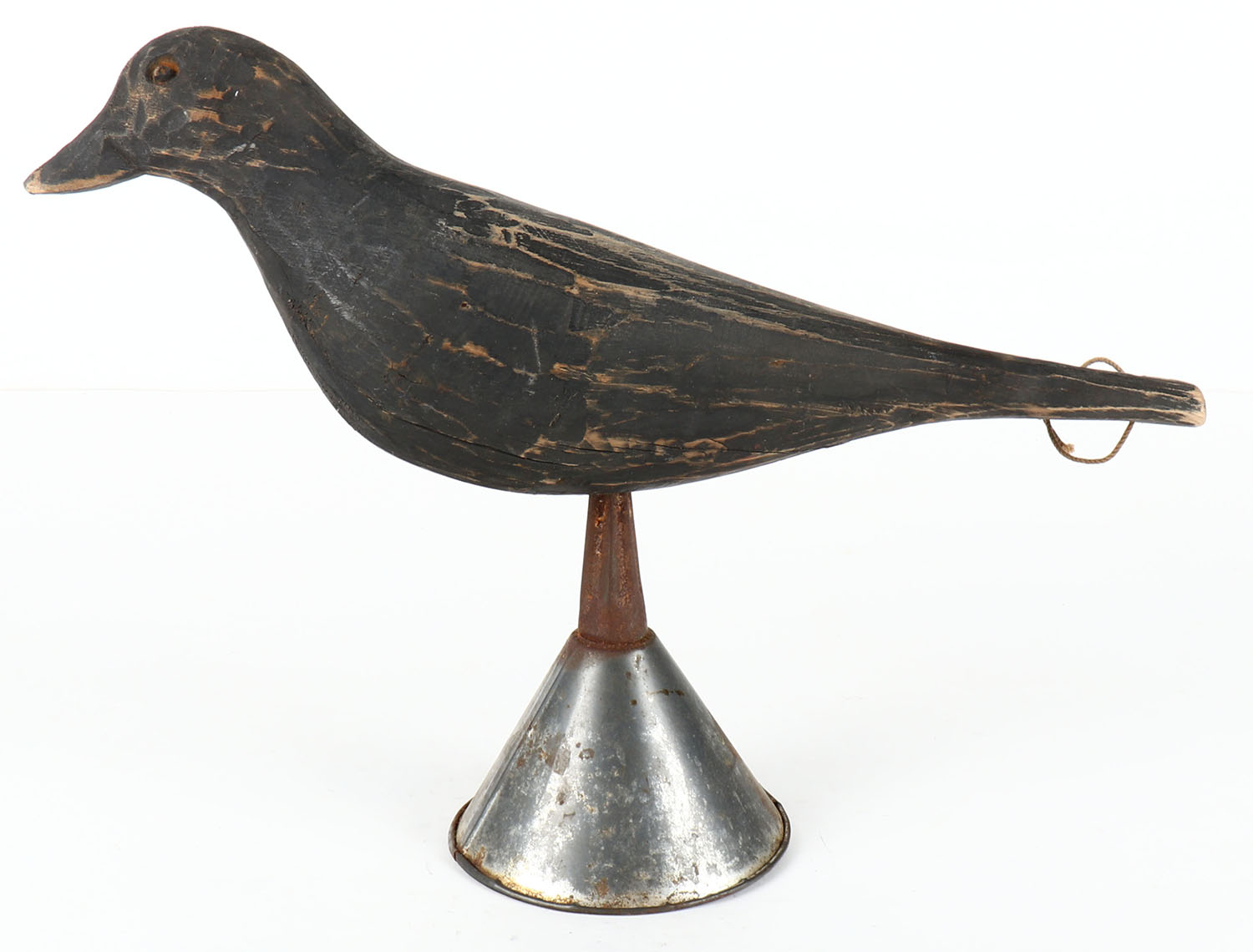 Crow decoy by unknown maker on metaql oil spout stand, no eyes, solid wood, original paint, 14 1/2'' OAL. Grade: Excellent - Value: 10 to 40