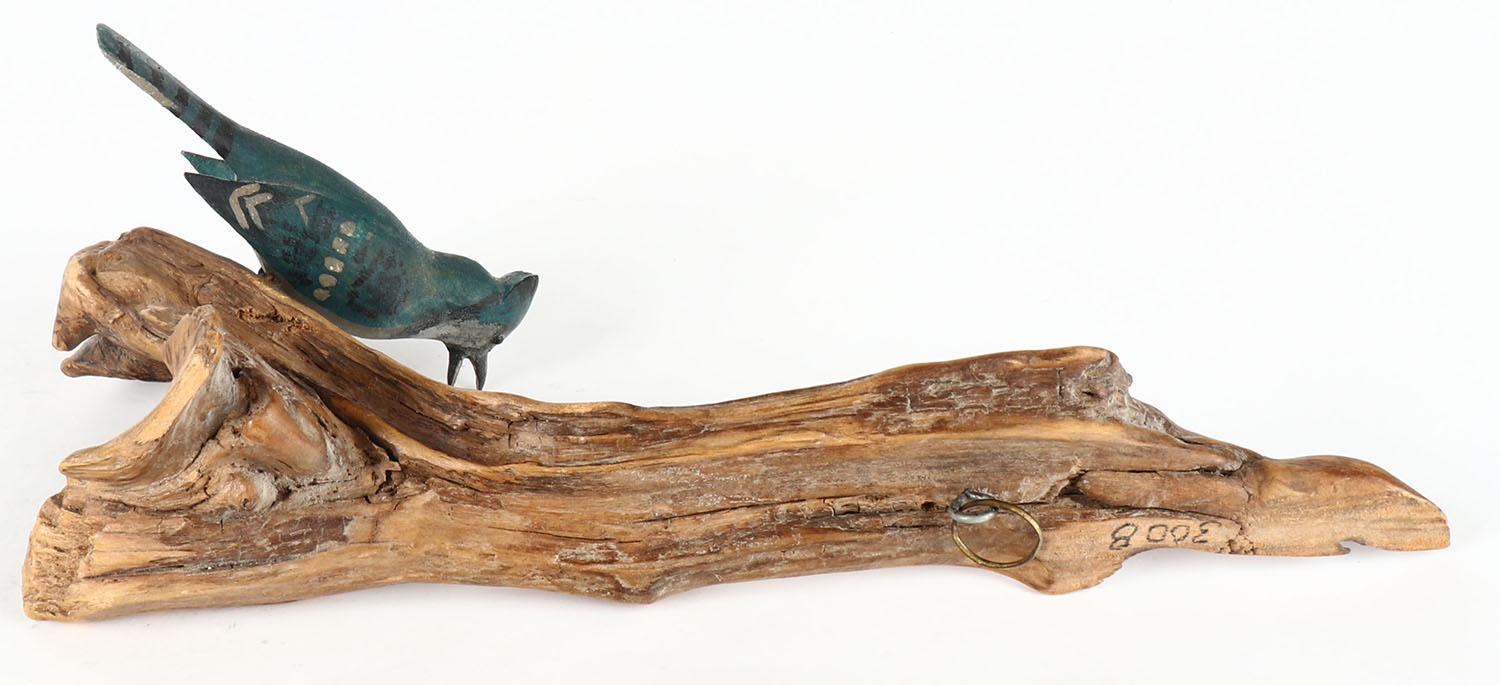 Miniature Bluejay on wood wall mount, unknown maker, PE, solid wood, mint original paint, bird is 5 1/2'' tall. Grade: Excellent ++ - Value: 10 to 50