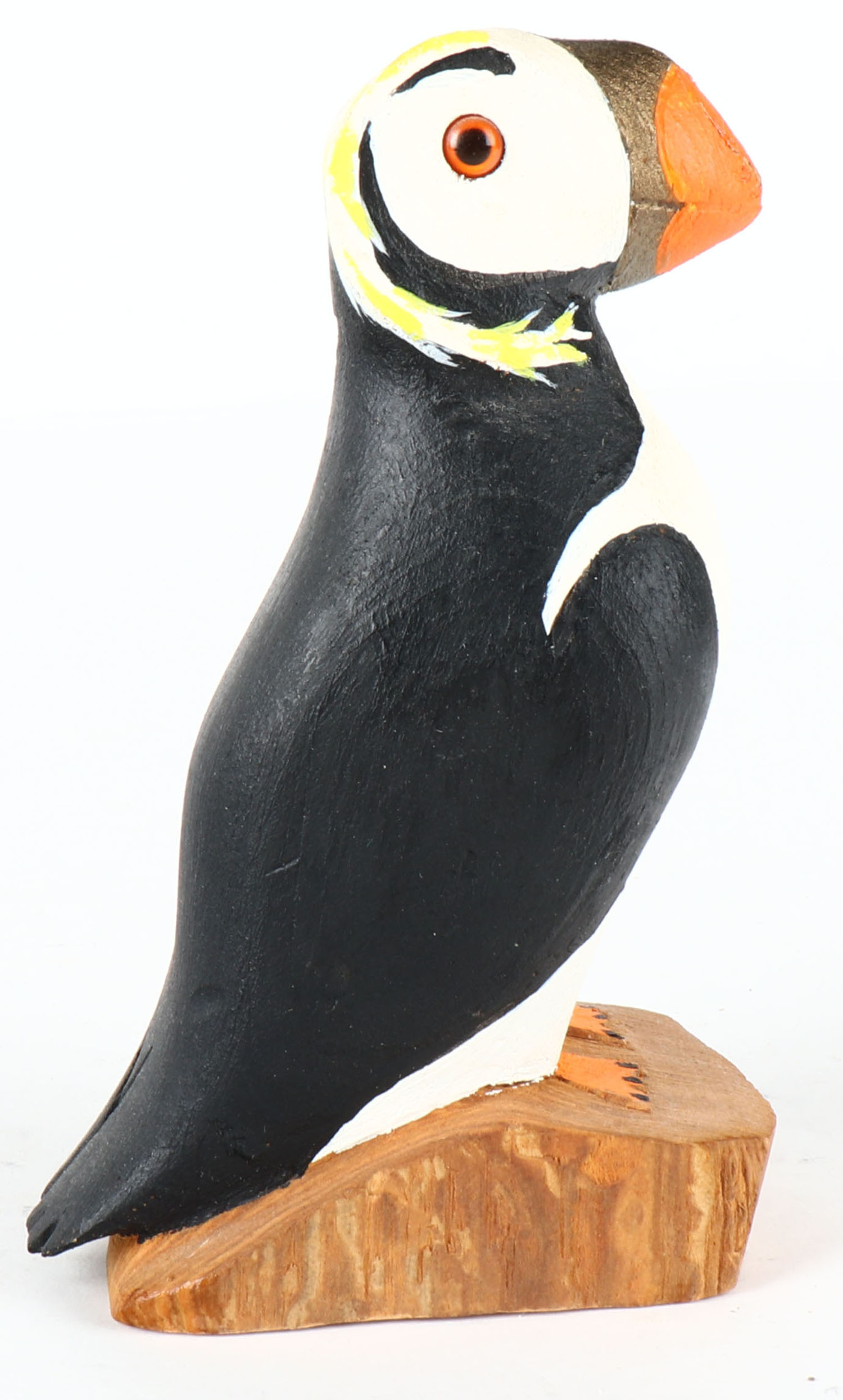 Puffin by Ed Moe Willow, AK, GE, solid wood, mint original paint on stand, 5'' tall. Grade: MINT - Value: 10 to 50